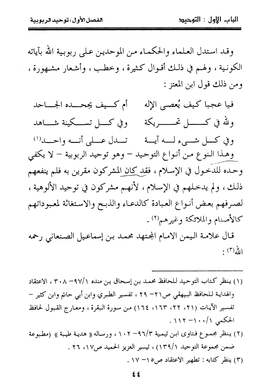 (١) ينظر كتاب التوحيد للحافظ محمد بن إسحاق بن منده ١/٩٧- ٣٠٨، الاعتقاد والهداية للحافظ البيهقي ص٢١- ٢٩، تفسير الطبري وابن أبي حاتم وابن كثير - تفسير الآيات (٢١، ٢٢، ١٦٣، ١٦٤) من سورة البقرة، ومعارج القبول لحافظ الحكمي ١/١٠٠- ١١٢.