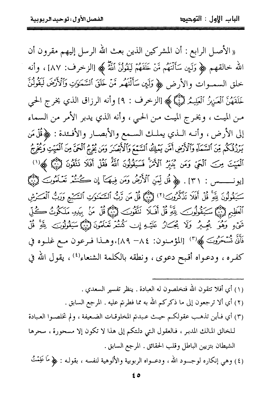" الأصل الرابع: أن المشركين الذين بعث الله الرسل إليهم مقرون أن الله خالقهم {وَلَئِنْ سَأَلْتَهُمْ مَنْ خَلَقَهُمْ لَيَقُولُنَّ اللَّهُ} [الزخرف: ٨٧] ، وأنه خلق السموات والأرض {وَلَئِنْ سَأَلْتَهُمْ مَنْ خَلَقَ السَّمَاوَاتِ وَالْأَرْضَ لَيَقُولُنَّ خَلَقَهُنَّ الْعَزِيزُ الْعَلِيمُ} [الزخرف: ٩] وأنه الرزاق الذي يخرج الحي من الميت، ويخرج الميت من الحي، وأنه الذي يدبر الأمر من السماء إلى الأرض، وأنه الذي يملك السمع والأبصار والأفئدة: {قُلْ مَنْ يَرْزُقُكُمْ مِنَ السَّمَاءِ وَالْأَرْضِ أَمَّنْ يَمْلِكُ السَّمْعَ وَالْأَبْصَارَ وَمَنْ يُخْرِجُ الْحَيَّ مِنَ الْمَيِّتِ وَيُخْرِجُ الْمَيِّتَ مِنَ الْحَيِّ وَمَنْ يُدَبِّرُ الْأَمْرَ فَسَيَقُولُونَ اللَّهُ فَقُلْ أَفَلا تَتَّقُونَ} (١) [يونس: ٣١] . {قُلْ لِمَنِ الْأَرْضُ وَمَنْ فِيهَا إِنْ كُنْتُمْ تَعْلَمُونَ سَيَقُولُونَ لِلَّهِ قُلْ أَفَلا تَذَكَّرُونَ (٢) قُلْ مَنْ رَبُّ السَّمَاوَاتِ السَّبْعِ وَرَبُّ الْعَرْشِ الْعَظِيمِ سَيَقُولُونَ لِلَّهِ قُلْ أَفَلا تَتَّقُونَ قُلْ مَنْ بِيَدِهِ مَلَكُوتُ كُلِّ شَيْءٍ وَهُوَ يُجِيرُ وَلا يُجَارُ عَلَيْهِ إِنْ كُنْتُمْ تَعْلَمُونَ (٣) سَيَقُولُونَ لِلَّهِ قُلْ فَأَنَّى تُسْحَرُونَ [المؤمنون: ٨٤- ٨٩] ، وهذا فرعون مع غلوه في كفره، ودعواه أقبح دعوى، ونطقه بالكلمة الشنعاء (٤) ، يقول الله في