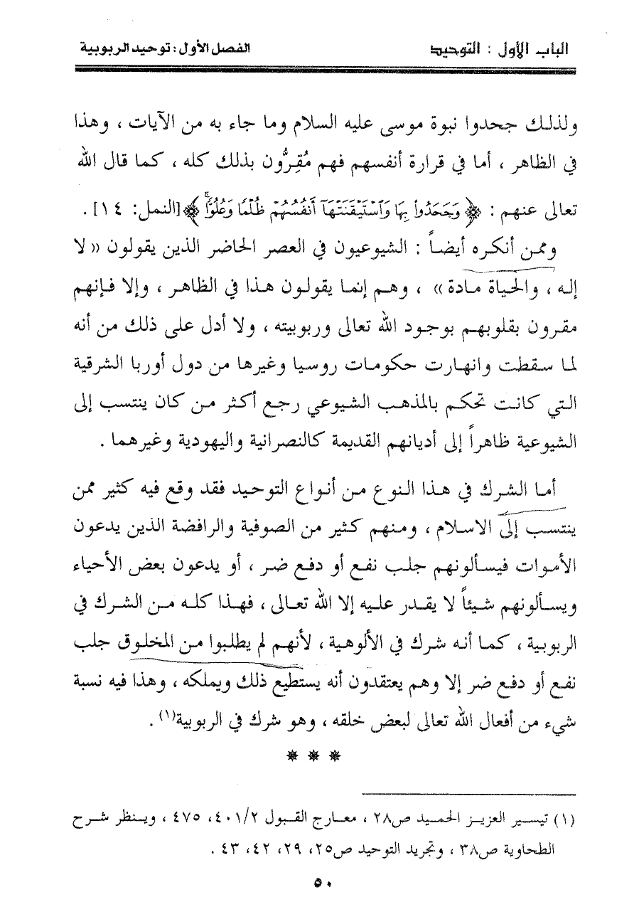 (١) تيسير العزيز الحميد ص٢٨، معارج القبول ٢/٤٠١، ٤٧٥، وينظر شرح الطحاوية ص٣٨، وتجريد التوحيد ص٢٥، ٢٩، ٤٢، ٤٣.