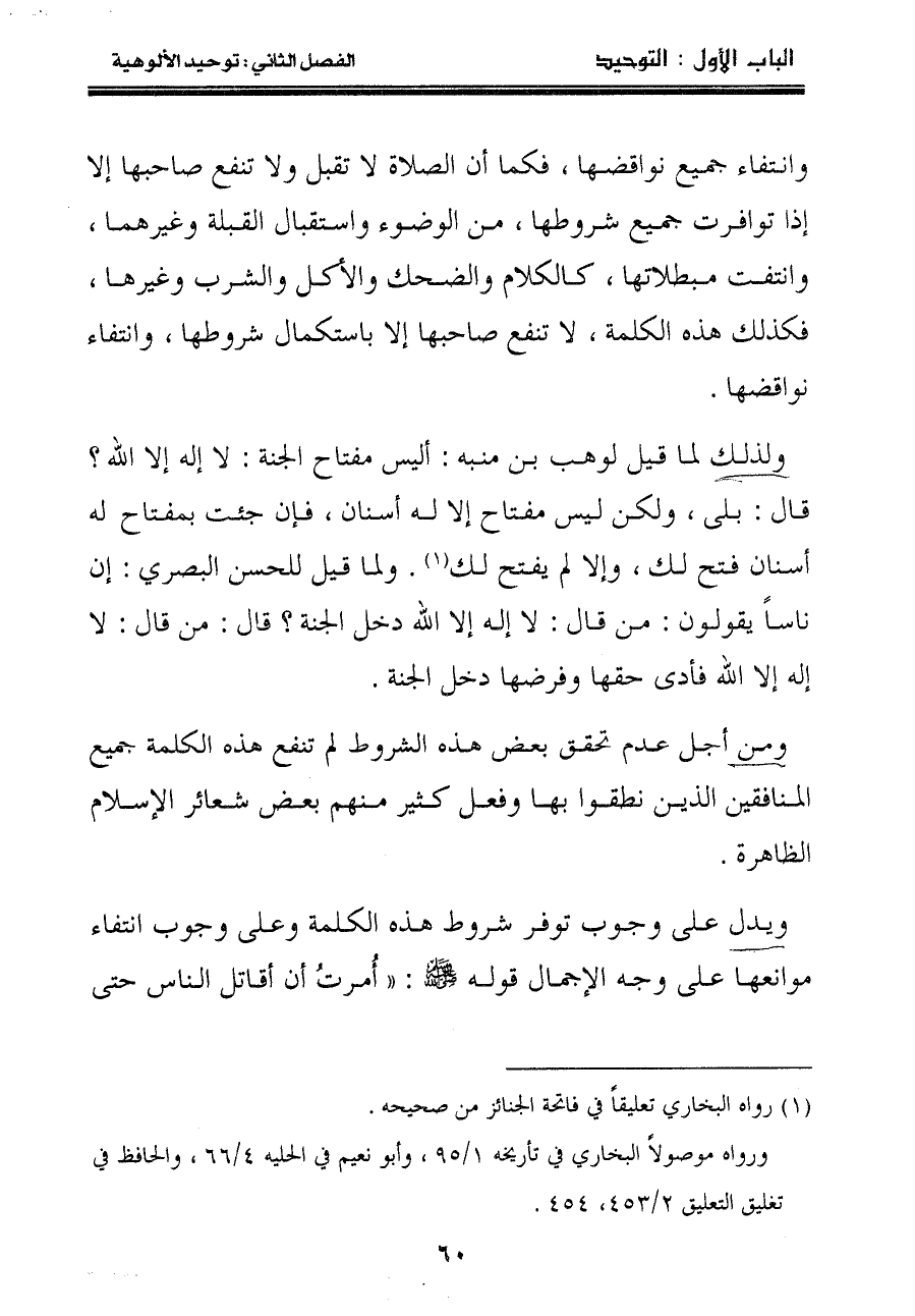 ولذلك لما قيل لوهب بن منبه: أليس مفتاح الجنة: لا إله إلا الله؟ قال: بلى، ولكن ليس مفتاح إلا له أسنان، فإن جئت بمفتاح له أسنان فتح لك، وإلا لم يفتح لك (١) . ولما قيل للحسن البصري: إن ناساً يقولون: من قال: لا إله إلا الله دخل الجنة؟ قال: من قال: لا إله إلا الله فأدى حقها وفرضها دخل الجنة.