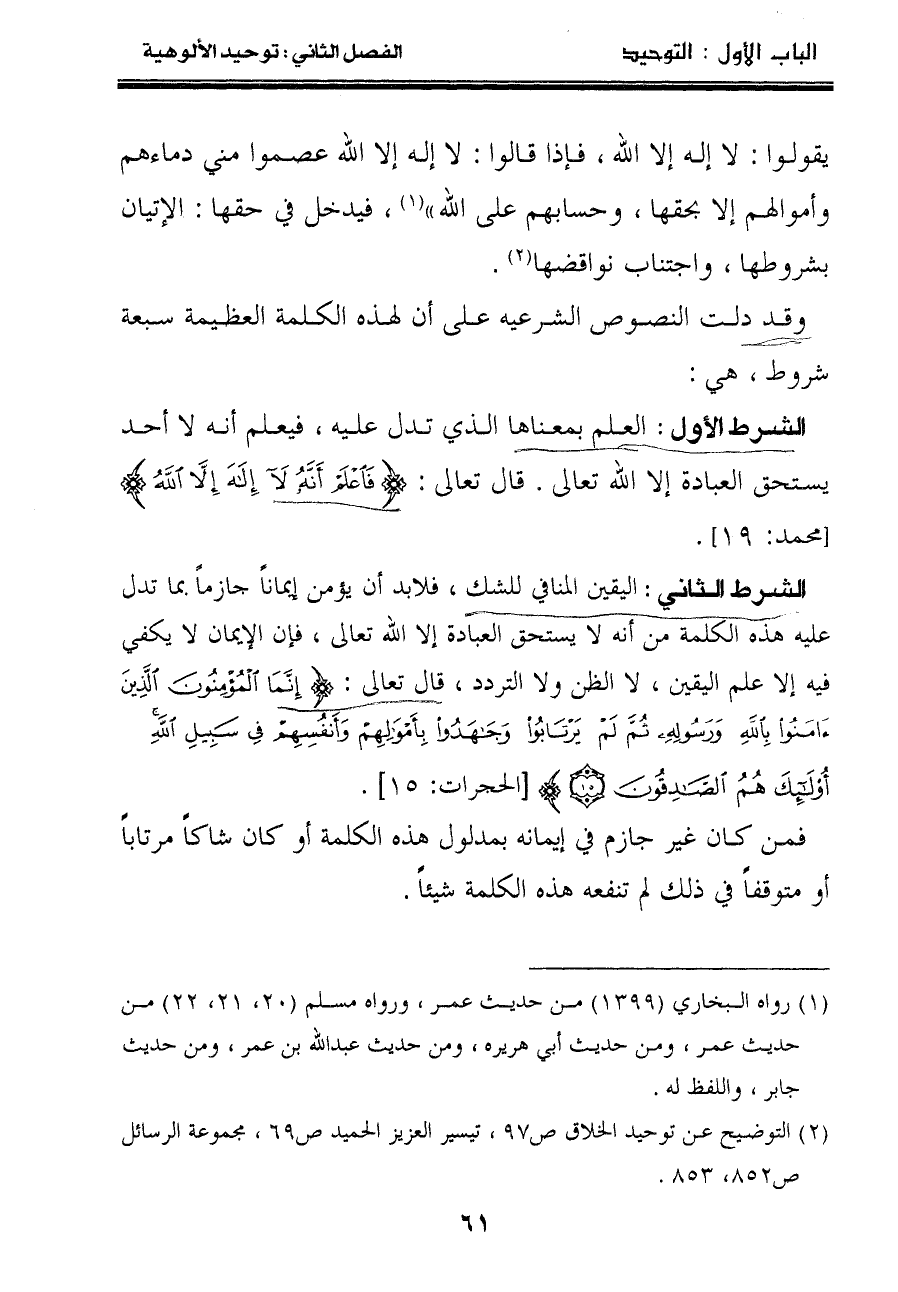 (٢) التوضيح عن توحيد الخلاق ص٩٧، تيسير العزيز الحميد ص٦٩، مجموعة الرسائل ص٨٥٢، ٨٥٣.