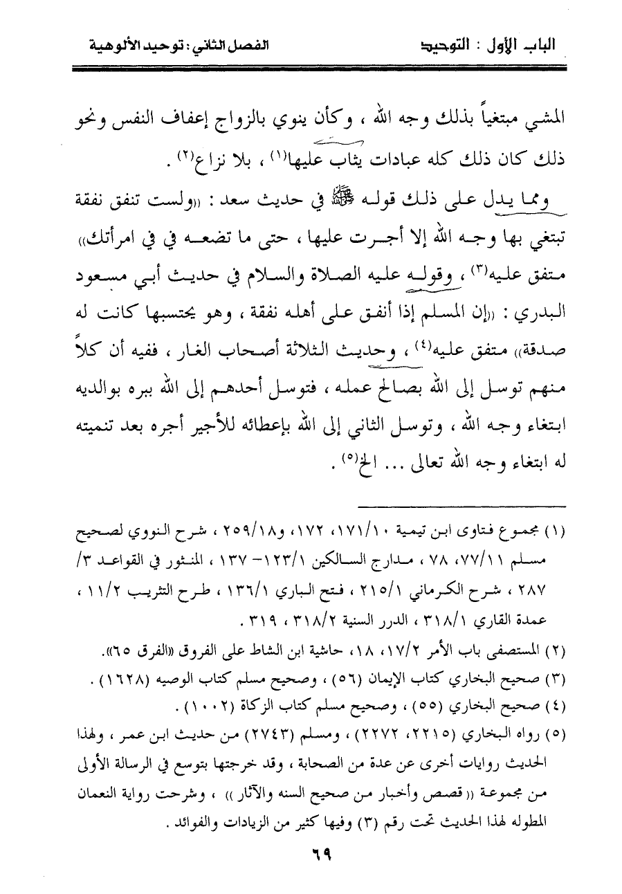 متفق عليه (٣) ، وقوله عليه الصلاة والسلام في حديث أبي مسعود البدري:" إن المسلم إذا أنفق على أهله نفقة، وهو يحتسبها كانت له صدقة "متفق عليه (٤) ، وحديث الثلاثة أصحاب الغار، ففيه أن كلاً منهم توسل إلى الله بصالح عمله، فتوسل أحدهم إلى الله ببره بوالديه ابتغاء وجه الله، وتوسل الثاني إلى الله بإعطائه للأجير أجره بعد تنميته له ابتغاء وجه الله تعالى ... الخ (٥) .