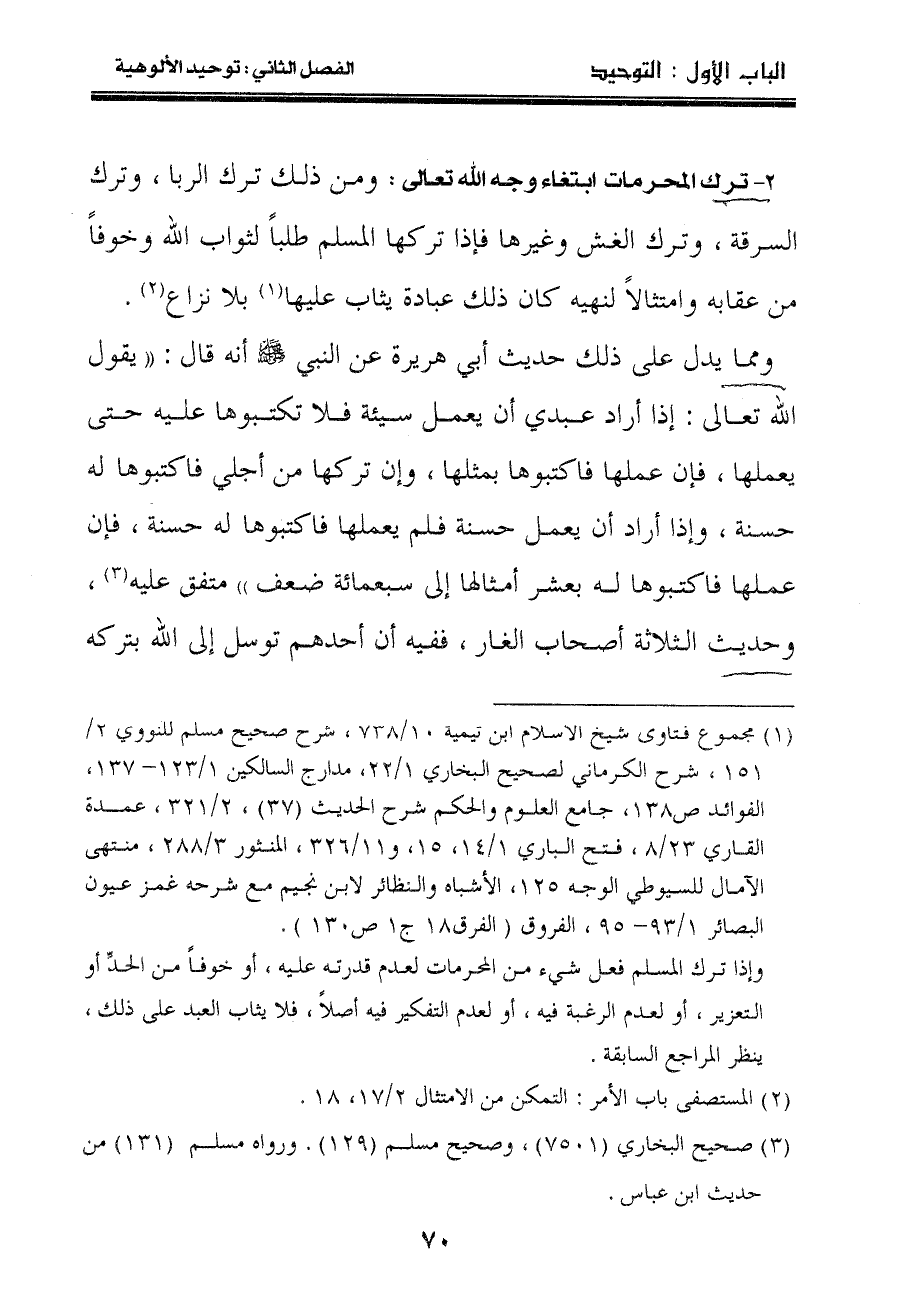 ٢- ترك المحرمات ابتغاء وجه الله تعالى: ومن ذلك ترك الربا، وترك السرقة، وترك الغش وغيرها فإذا تركها المسلم طلباً لثواب الله وخوفاً من عقابه وامتثالاً لنهيه كان ذلك عبادة يثاب عليها (١) بلا نزاع (٢) .