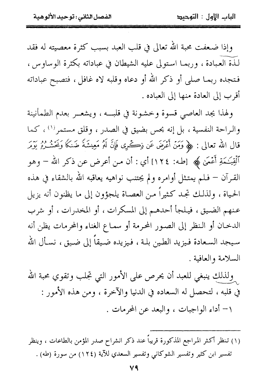 (١) تنظر أكثر المراجع المذكورة قريباً عند ذكر انشراح صدر المؤمن بالطاعات، وينظر تفسير ابن كثير وتفسير الشوكاني وتفسير السعدي للآية (١٢٤) من سورة (طه) .