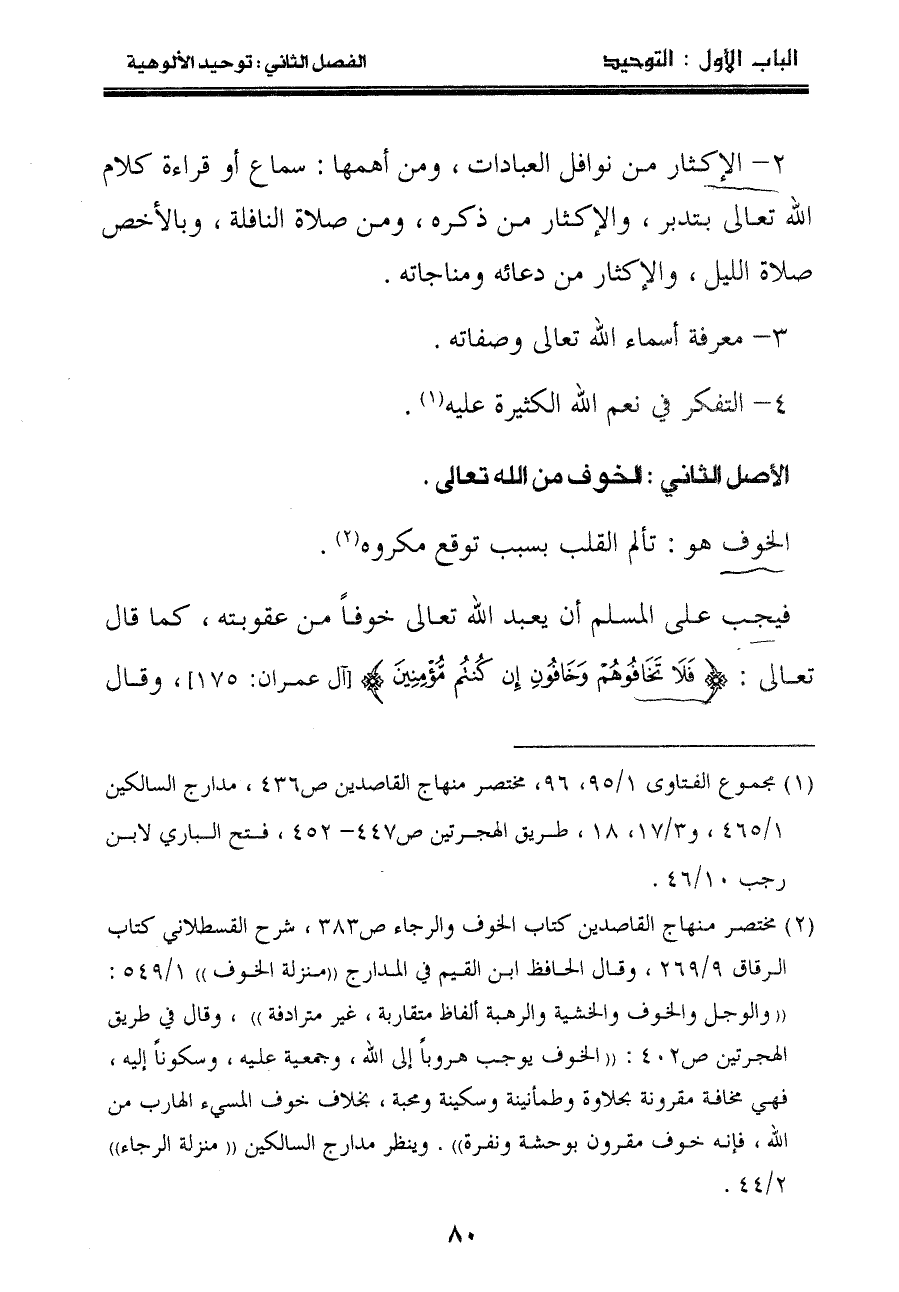 (٢) مختصر منهاج القاصدين كتاب الخوف والرجاء ص٣٨٣، شرح القسطلاني كتاب الرقاق ٩/٢٦٩، وقال الحافظ ابن القيم في المدارج "منزلة الخوف"١/٥٤٩: "والوجل والخوف والخشية والرهبة ألفاظ متقاربة، غير مترادفة"، وقال في طريق الهجرتين ص٤٠٢: "الخوف يوجب هروباً إلى الله، وجمعية عليه، وسكوناً إليه، فهي مخافة مقرونة بحلاوة وطمأنينة وسكينة ومحبة، بخلاف خوف المسيء الهارب من الله، فإنه خوف مقرون بوحشة ونفرة". وينظر مدارج السالكين "منزلة الرجاء"٢/٤٤.