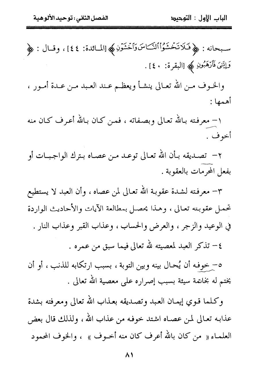 سبحانه: {فَلا تَخْشَوُا النَّاسَ وَاخْشَوْنِ} [المائدة: ٤٤] ، وقال: {وَإِيَّايَ فَارْهَبُونِ} [البقرة: ٤٠] .