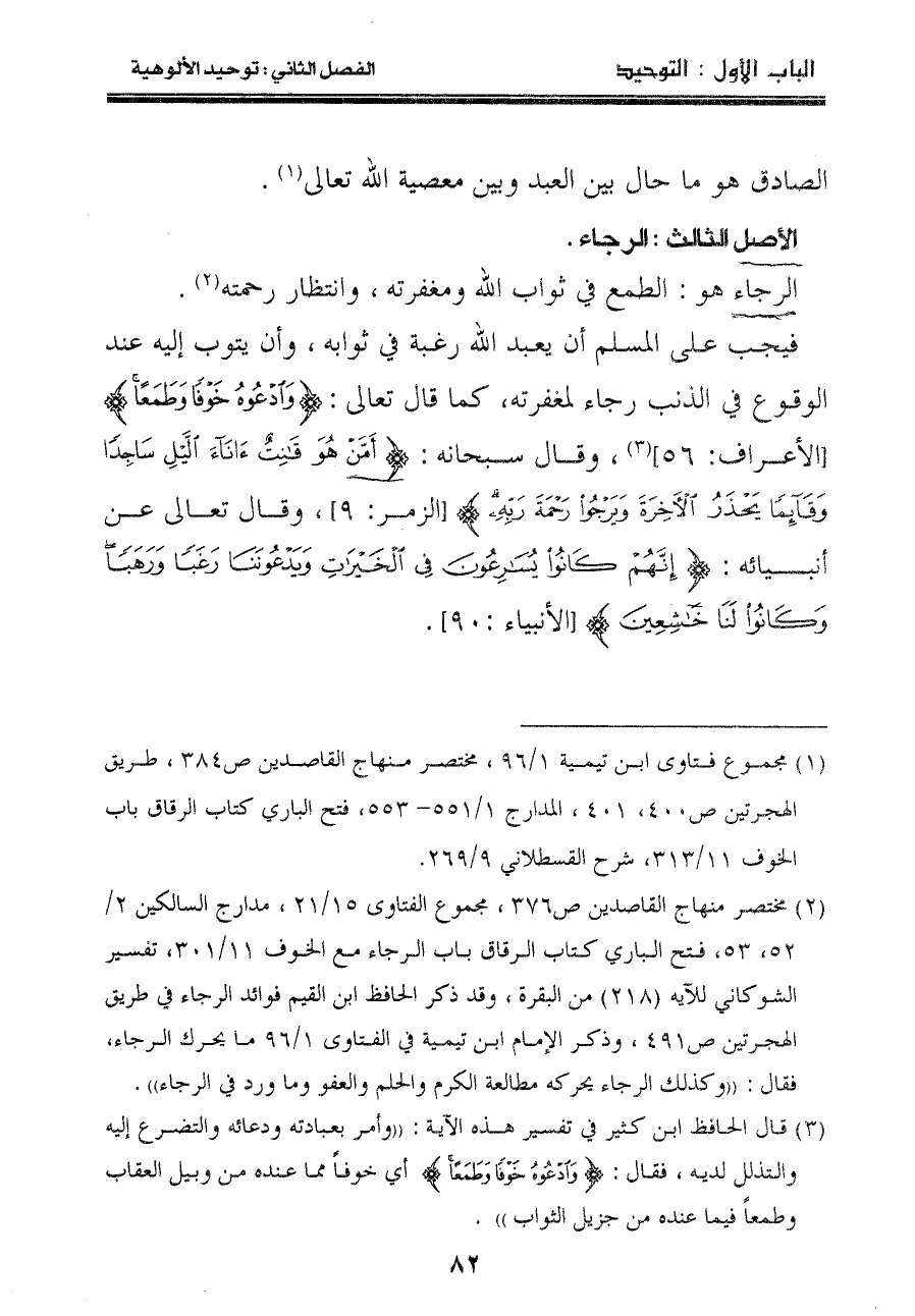 (٢) مختصر منهاج القاصدين ص٣٧٦، مجموع الفتاوى ١٥/٢١، مدارج السالكين ٢/٥٢، ٥٣، فتح الباري كتاب الرقاق باب الرجاء مع الخوف ١١/٣٠١، تفسير الشوكاني للآيه (٢١٨) من البقرة، وقد ذكر الحافظ ابن القيم فوائد الرجاء في طريق الهجرتين ص٤٩١، وذكر الإمام ابن تيمية في الفتاوى ١/٩٦ ما يحرك الرجاء، فقال: "وكذلك الرجاء يحركه مطالعة الكرم والحلم والعفو وما ورد في الرجاء".