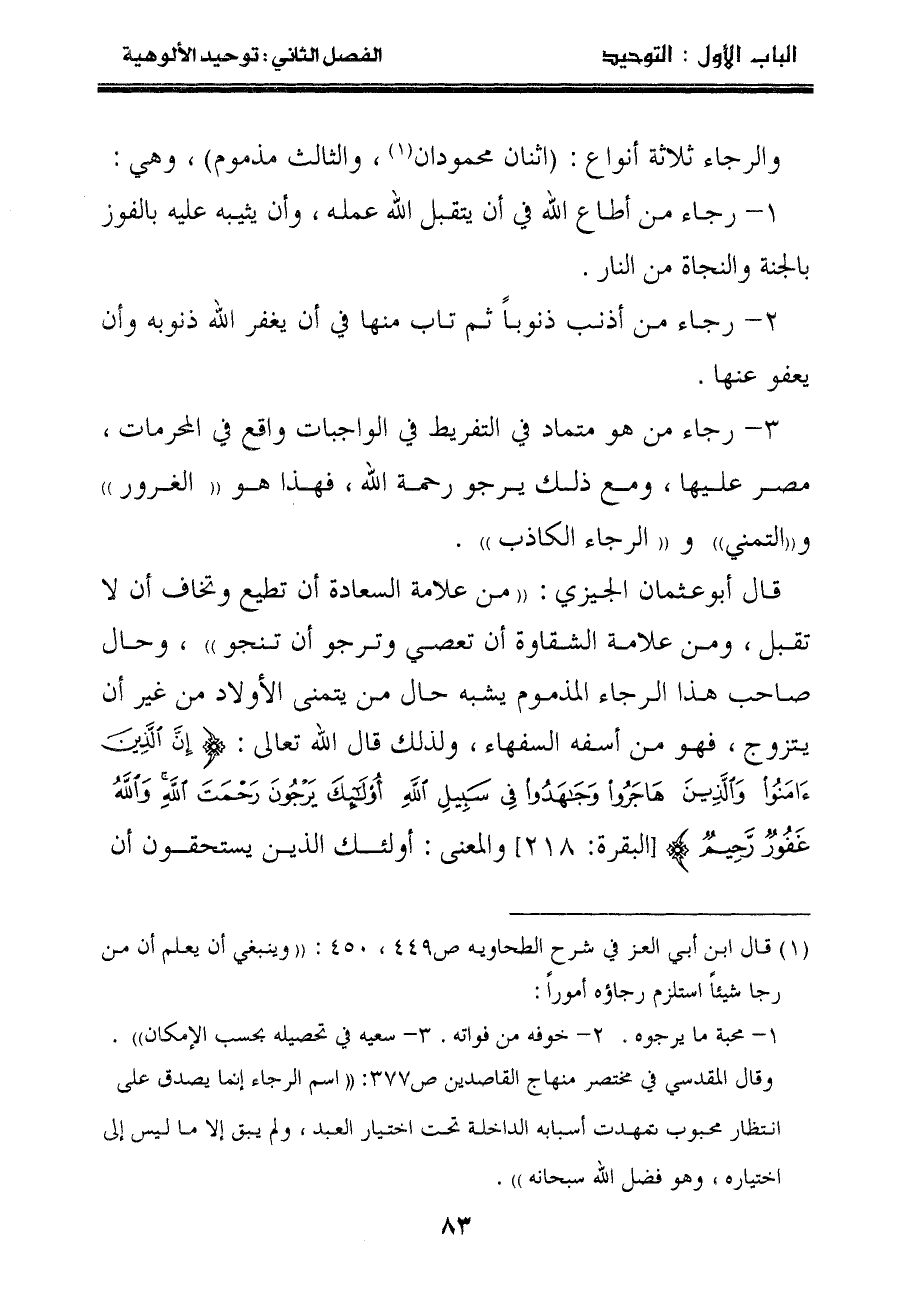 (١) قال ابن أبي العز في شرح الطحاويه ص٤٤٩، ٤٥٠: "وينبغي أن يعلم أن من رجا شيئاً استلزم رجاؤه أموراً: