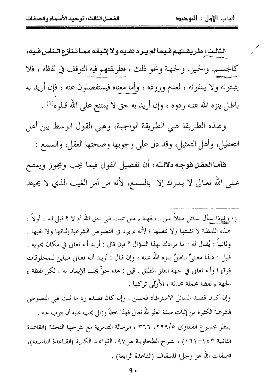 "١" فإذا سأل سائل مثلاً عن "الجهة"هل تثبت في حق الله أم لا؟ قيل له: أولاً: هذه اللفظة لا نثبتها ولا ننفيها؛ لأنه لم يرد في النصوص الشرعية إثباتها ولا نفيها. وثانياً: يُقال له: ما مرادك بهذا السؤال؟ فإن قال: أريد أنه تعالى في مكان يحويه. قيل: هذا معنىً باطلٌ ينزه الله عنه، وإن قال: أريد أنه تعالى مباين للمخلوقات فوقها وأنه تعالى في جهة العلو المطلق. قيل: هذا حقٌّ يجب الإيمان به، لكن لفظة "الجهة"لفظة مجملة محدثة، الأَوْلَى تركها.