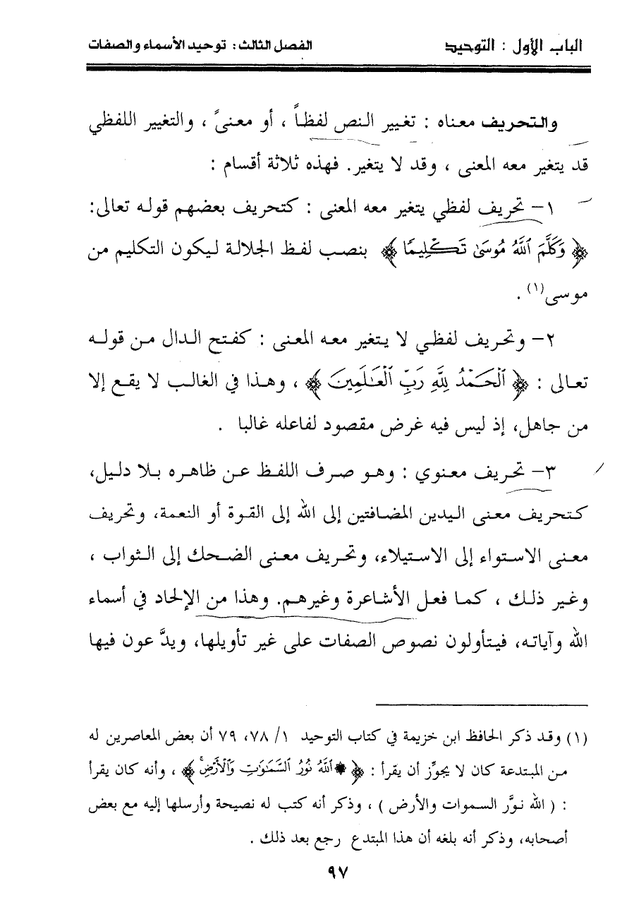 والتحريف معناه: تغيير النص لفظاً، أو معنىً، والتغيير اللفظي قد يتغير معه المعنى، وقد لا يتغير. فهذه ثلاثة أقسام: