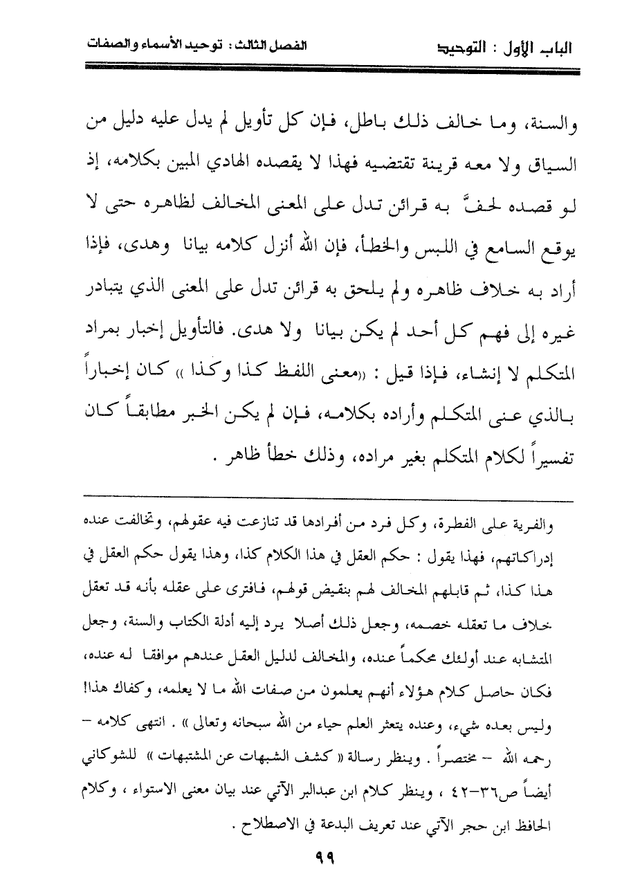 والفرية على الفطرة، وكل فرد من أفرادها قد تنازعت فيه عقولهم، وتخالفت عنده إدراكاتهم، فهذا يقول: حكم العقل في هذا الكلام كذا، وهذا يقول حكم العقل في هذا كذا، ثم قابلهم المخالف لهم بنقيض قولهم، فافترى على عقله بأنه قد تعقل خلاف ما تعقله خصمه، وجعل ذلك أصلا يرد إليه أدلة الكتاب والسنة، وجعل المتشابه عند أولئك محكماً عنده، والمخالف لدليل العقل عندهم موافقا له عنده، فكان حاصل كلام هؤلاء أنهم يعلمون من صفات الله ما لا يعلمه، وكفاك هذا! وليس بعده شيء، وعنده يتعثر العلم حياء من الله سبحانه وتعالى". انتهى كلامه - رحمه الله - مختصراً. وينظر رسالة "كشف الشبهات عن المشتبهات"للشوكاني أيضاً ص٣٦-٤٢، وينظر كلام ابن عبد البر الآتي عند بيان معنى الاستواء، وكلام الحافظ ابن حجر الآتي عند تعريف البدعة في الاصطلاح.