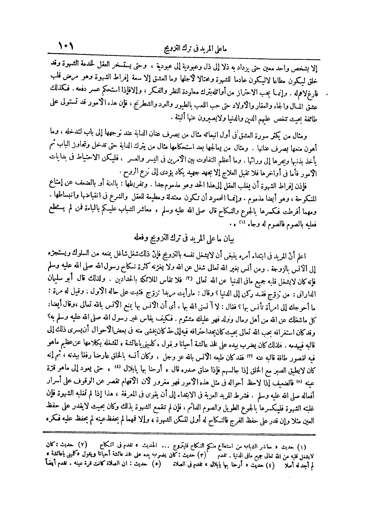 اعلم أن المريد في ابتداء أمره ينبغي أن لا يشغل نفسه بالتزويج فإن ذلك شغل شاغل يمنعه من السلوك ويستجره إلى الأنس بالزوجة ومن أنس بغير الله تعالى شغل عن الله ولا يغرنه كثرة نكاح رَسُولِ اللَّهِ صَلَّى اللَّهُ عَلَيْهِ وَسَلَّمَ فَإِنَّهُ كان لا يشغل قلبه جميع ما في الدنيا عن الله تعالى (¬2) فلا تقاس الملائكة بالحدادين ولذلك قال أبو سليمان الداراني من تزوج فقد ركن إلى الدنيا وقال ما رأيت مريداً تزوج فثبت على حاله الأول وقيل له مرة ما أحوجك إلى امرأة تأنس بها فقال لا آنسني الله بها أي أن الأنس بها يمنع الأنس بالله تعالى وقال أيضاً كل ما شغلك عن الله من أهل ومال وولد فهو عليك مشئوم فكيف يقاس غير رسول الله صلى الله عليه وسلم به وقد كان استغراقه بحب الله تعالى بحيث كان يجد احتراقه فيه إلى حد كان يخشى منه في بعض الأحوال أن يسري ذلك إلى قالبه فيهدمه فلذلك كان يضرب بيده على فخذ عائشة أحياناً ويقول كلميني يا عائشة لتشغله بكلامها عن عظيم ما هو فيه لقصور طاقة قالبه عنه (¬3) فقد كان طبعه الأنس بالله عز وجل وكان أنسه بالخلق عارضاً رفقاً ببدنه ثم إنه كان لا يطيق الصبر مع الخلق إذا جالسهم فإذا ضاق صدره قال أرحنا بها يا بلال (¬4) حتى يعود إلى ما هو قرة عينه // حديث أن الصلاة كانت قرة عينه تقدم أيضا فالضعيف إذا لاحظ أحواله في مثل هذه الأمور فهو مغرور لأن الأفهام تقصر عن الوقوف على أسرار أفعاله صلى الله عليه وسلم فشرط المريد العزبة في الابتداء إلى أن يقوى في المعرفة هذا إذا لم تغلبه الشهوة فإن غلبته الشهوة فليكسرها بالجوع الطويل والصوم الدائم فإن لم تنقمع الشهوة بذلك وكان بحيث لا يقدر على حفظ العين مثلاً وإن قدر على حفظ الفرج فالنجاح له أولى لتسكن الشهوة وإلا فمهما لم يحفظ عينه لم يحفظ عليه فكره
