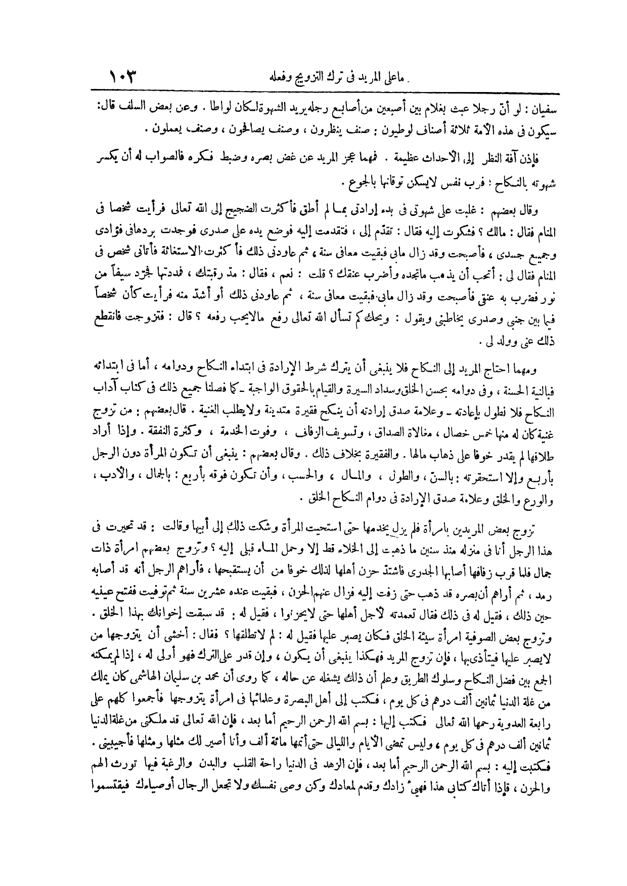 وقال بعضهم غلبت على شهوتي في بدء إرادتي بما لم أطق فأكثرت الضجيج إلى الله تعالى فرأيت شخصاً في المنام فقال مالك فشكوت إليه فقال تقدم إلي فتقدمت إليه فوضع يده على صدري فوجدت بردها في فؤادي وجميع جسدي فأصبحت وقد زال ما بي فبقيت معافى سنة ثم عاودني ذلك فأكثرت الاستغاثة فأتاني شخص في المنام فقال لي أتحب أن يذهب ما تجده وأضرب عنقك قلت نعم فقال مد رقبتك فمددتها فجرد سيفاً من نور فضرب به عنقي فأصبحت وقد زال ما بي فبقيت معافى سنة ثم عاودني ذلك أو أشد منه فرأيت كأن شخصاً فيما بين جنبي وصدري يخاطبني ويقول ويحك كم تسأل الله تعالى ما لا يحب رفعه قال فتزوجت فانقطع ذلك عني وولد لي