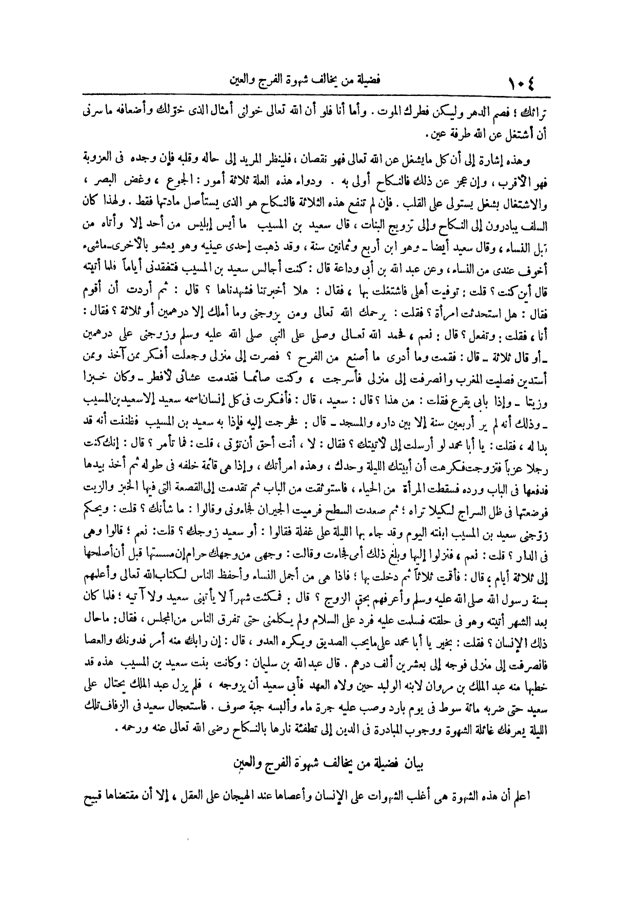 وهذه إشارة إلى أن كل ما يشغل عن الله تعالى فهو نقصان فلينظر المريد إلى حاله وقلبه فإن وجده في العزوبة فهو الأقرب وإن عجز عن ذلك فالنكاح أولى به ودواء هذه العلة ثلاثة أمور الجوع وغض البصر والاشتغال بشغل يستولي على القلب فإن لم تنفع هذه الثلاثة فالنكاح هو الذي يستأصل مادتها فقط ولهذا كان السلف يبادرون إلى النكاح وإلى تزويج البنات قال سعيد بن المسيب ما أيس إبليس من أحد إلا وأتاه من قبل النساء وقال سعيد أيضاً وهو ابن أربع وثمانين سنة وقد ذهبت إحدى عينيه وهو يعشو بالأخرى ما شيء أخوف عندي من النساء وعن عبد الله بن أبي وداعة قال كنت أجالس سعيد بن المسيب فتفقدني أياماً فلما أتيته قال أين كنت قلت توفيت أهلي فاشتغلت بها فقال هلا أخبرتنا فشهدناها قال ثم أردت أن أقوم فقال هل استحدثت امرأة فقلت يرحمك الله تعالى ومن يزوجني وما أملك إلا درهمين أو ثلاثة فقال أنا فقلت وتفعل قال نعم فحمد الله تعالى وصلى على النبي صلى الله عليه وسلم وزوجني على درهمين أو قال ثلاثة قال فقمت وما أدري ما أصنع من الفرح فصرت إلى منزلي وجعلت أفكر ممن آخذ وممن أستدين فصليت المغرب وانصرفت إلى منزلي فأسرجت وكنت صائماً فقدمت عشائي لأفطر وكان خبزاً وزيتاً وإذا بابي يقرع فقلت من هذا قال سعيد قال فأفكرت في كل إنسان اسمه سعيد إلا سعيد بن المسيب وذلك أنه لم ير أربعين سنة إلا بين داره والمسجد قال فخرجت إليه فإذا به سعيد بن المسيب فظننت أنه قد بدا له فقلت يا أبا محمد لو أرسلت إلي لأتيتك فقال لا أنت أحق أن تؤتى قلت فما تأمر قال إنك كنت رجلاً عزباً فتزوجت فكرهت أن أبيتك الليلة وحدك وهذه امرأتك وإذا هي قائمة خلفه في طوله ثم أخذ بيدها فدفعها في الباب ورده فسقطت المرأة من الحياء فاستوثقت من الباب ثم تقدمت إلى القصعة التي فيها الخبز والزيت فوضعتها في ظل السراج لكيلا تراه ثم صعدت السطح فرميت الجيران فجاءوني وقالوا ما شأنك قلت ويحكم زوجني سعيد بن المسيب ابنته اليوم وقد جاء بها الليلة على غفلة فقالوا أو سعيد زوجك قلت نعم قالوا وهي في الدار قلت نعم فنزلوا إليها وبلغ ذلك أمي فجاءت وقالت وجهي من وجهك حرام إن مسستها قبل أن أصلحها إلى ثلاثة أيام قال فأقمت ثلاثاً ثم دخلت بها فإذا هي من أجمل النساء وأحفظ الناس لكتاب الله تعالى وأعلمهم بِسُنَّةِ رَسُولِ اللَّهِ صَلَّى اللَّهُ عَلَيْهِ وَسَلَّمَ وأعرفهم بحق الزوج قال فمكثت شهراً لا يأتيني سعيد ولا آتيه فلما كان بعد الشهر أتيته وهو في حلقته فسلمت عليه فرد علي السلام ولم يكلمني حتى تفرق الناس من المجلس فقال ما حال ذلك الإنسان فقلت بخير يا أبا محمد على ما يحب الصديق ويكره العدو قال إن رابك منه أمر فدونك والعصا فانصرفت إلى منزلي فوجه إلي بعشرين ألف درهم قال عبد الله بن سليمان وكانت بنت سعيد بن المسيب هذه قد خطبها منه عبد الملك بن مروان لابنه الوليد حين ولاه العهد فأبى سعيد أن يزوجه فلم يزل عبد الملك يحتال على سعيد حتى ضربه مائة سوط في يوم بارد وصب عليه جرة ماء وألبسه جبة صوف فاستعجال سعيد في الزفاف تلك الليلة يعرفك غائلة الشهوة ووجوب المبادرة في الدين إلى تطفئة نارها بالنكاح رضي الله تعالى عنه ورحمه