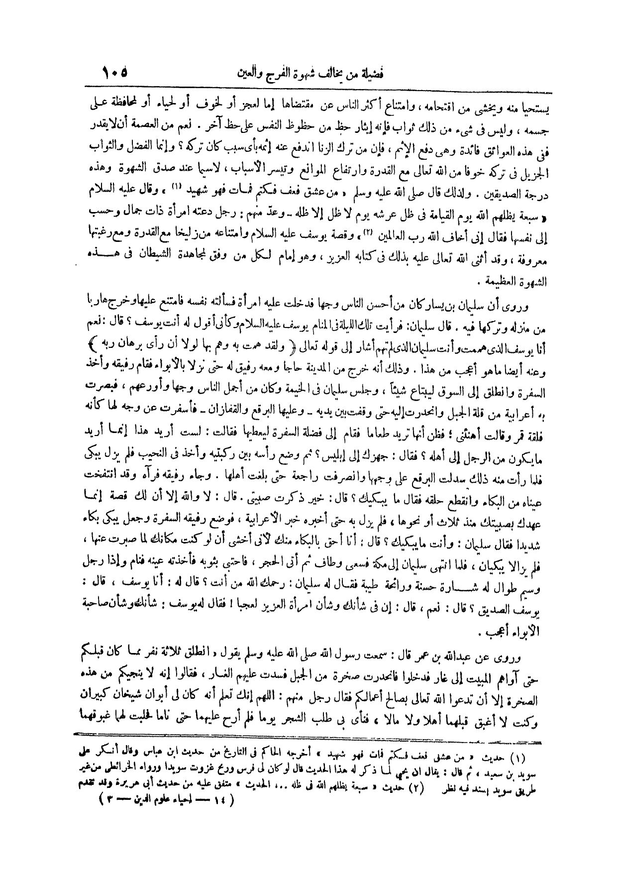 وقال صلى الله عليه وسلم سبعة يظلهم الله يوم القيامة في ظل عرشه يوم لا ظل إلا ظله وعد منهم رجل دعته امرأة ذات جمال وحسب إلى نفسها فقال إني أخاف الله رب العالمين (¬2) وقصة يوسف عليه السلام وامتناعه من زليخا مع القدرة ومع رغبتها معروفة وقد أثنى الله تعالى عليه بذلك في كتابه العزيز وهو إمام لكل من وفق لمجاهدة الشيطان في هذه الشهوة العظيمة