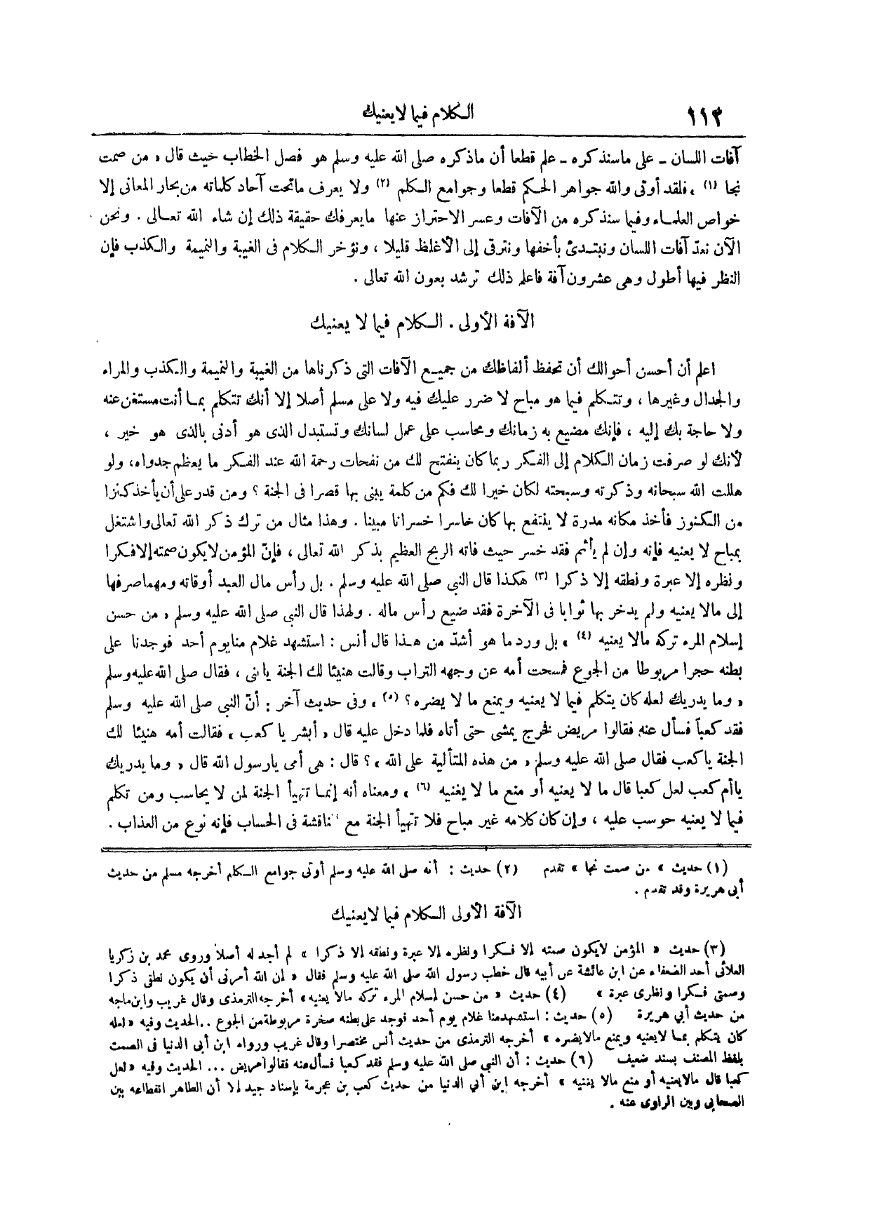 ونحن الآن نعد آفات اللسان ونبتديء بأخفها ونترقى إلى الأغلظ قليلاً ونؤخر الكلام في الغيبة والنميمة والكذب فإن النظر فيها أطول وهي عشرون آفة فاعلم ذلك ترشد بعون الله تعالى الآفة الأولى الكلام فيما لا يعنيك