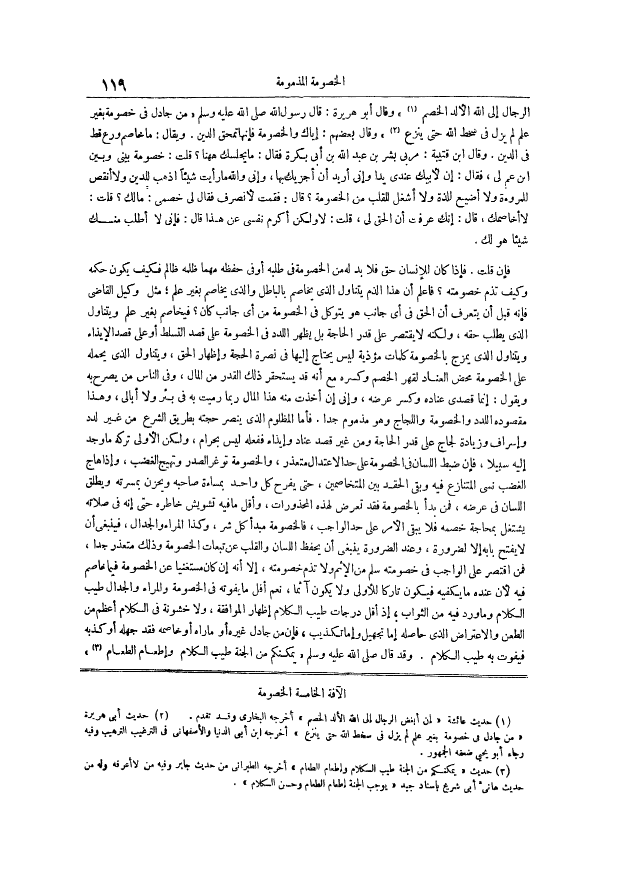 فإن قلت فإذا كان للإنسان حق فلا بد له من الخصومة في طلبه أو في حفظه مهما ظلمه ظالم فكيف يكون حكمه وكيف تذم خصومته فاعلم أن هذا الذم يتناول الذي يخاصم بالباطل والذي يخاصم بغير علم مثل وكيل القاضي فإنه قبل أن يتعرف أن الحق في أي جانب هو يتوكل في الخصومة من أي جانب كان فيخاصم بغير علم ويتناول الذي يطلب حقه ولكنه لا يقتصر على قدر الحاجة بل يظهر اللدد في الخصومة على قصد التسلط أو على قصد الإيذاء ويتناول الذي يمزج بالخصومة كلمات مؤذية ليس يحتاج إليها في نصرة الحجة وإظهار الحق ويتناول الذي يَحْمِلُهُ عَلَى الْخُصُومَةِ مَحْضُ الْعِنَادِ لِقَهْرِ الْخَصْمِ وَكَسْرِهِ مَعَ أَنَّهُ قَدْ يَسْتَحْقِرُ ذَلِكَ الْقَدْرَ مِنَ الْمَالِ وَفِي النَّاسِ مَنْ يُصَرِّحُ بِهِ ويقول إنما قصدي عناده وكسر عرضه وَإِنِّي إِنْ أَخَذْتُ مِنْهُ هَذَا الْمَالَ رُبَّمَا رِمَيْتُ بِهِ فِي بِئْرٍ وَلَا أُبَالِي وَهَذَا مَقْصُودُهُ اللَّدَدُ وَالْخُصُومَةُ وَاللَّجَاجُ وَهُوَ مَذْمُومٌ جِدًّا فَأَمَّا الْمَظْلُومُ الَّذِي يَنْصُرُ حُجَّتَهُ بِطَرِيقِ الشَّرْعِ مِنْ غَيْرِ لَدَدٍ وَإِسْرَافٍ وَزِيَادَةِ لَجَاجٍ عَلَى قَدْرِ الْحَاجَةِ وَمِنْ غَيْرِ قَصْدِ عِنَادٍ وَإِيذَاءٍ فَفِعْلُهُ لَيْسَ بِحَرَامٍ وَلَكِنِ الْأَوْلَى تَرْكُهُ مَا وَجَدَ إِلَيْهِ سَبِيلًا فَإِنَّ ضَبْطَ اللِّسَانِ فِي الخصومة على حد الِاعْتِدَالِ مُتَعَذِّرٌ وَالْخُصُومَةُ تُوغِرُ الصَّدْرَ وَتُهَيِّجُ الْغَضَبَ وإذا هاج الغضب نُسِيَ الْمُتَنَازَعُ فِيهِ وَبَقِيَ الْحِقْدُ بَيْنَ الْمُتَخَاصِمَيْنِ حَتَّى يَفْرَحَ كُلُّ وَاحِدٍ بِمَسَاءَةِ صَاحِبِهِ وَيَحْزَنَ بِمَسَرَّتِهِ وَيُطْلِقَ اللِّسَانَ فِي عِرْضِهِ فَمَنْ بَدَأَ بِالْخُصُومَةِ فَقَدْ تَعَرَّضَ لِهَذِهِ الْمَحْذُورَاتِ وَأَقَلُّ مَا فِيهِ تَشْوِيشُ خَاطِرِهِ حَتَّى إِنَّهُ فِي صَلَاتِهِ يَشْتَغِلُ بِمُحَاجَّةِ خَصْمِهِ فَلَا يَبْقَى الْأَمْرُ عَلَى حَدِّ الْوَاجِبِ فَالْخُصُومَةُ مَبْدَأُ كُلِّ شَرٍّ وَكَذَا الْمِرَاءُ وَالْجِدَالُ فَيَنْبَغِي أَنْ لَا يَفْتَحَ بَابَهُ إِلَّا لِضَرُورَةٍ وَعِنْدَ الضَّرُورَةِ يَنْبَغِي أَنْ يَحْفَظَ اللِّسَانَ وَالْقَلْبَ عَنْ تَبِعَاتِ الْخُصُومَةِ وَذَلِكَ مُتَعَذِّرٌ جداً فمن اقتصر على الواجب في خصومته سلم من الإثم ولا تذم خصومته إلا أنه إن كان مستغنياً عن الخصومة فيما خاصم فيه لأن عنده ما يكفيه فيكون تاركاً للأولى ولا يكون آثماً نَعَمْ أَقَلُّ مَا يَفُوتُهُ فِي الْخُصُومَةِ وَالْمِرَاءِ والجدال طيب الكلام وما ورد فيه من الثواب إذ أقل درجات طيب الكلام إظهار الموافقة ولا خشونة في الكلام أعظم من الطعن والاعتراض الذي حاصله إما تجهيل وإما تكذيب فإن من جادل غيره أو ماراه أو خاصمه فقد جهله أو كذبه فيفوت به طيب الكلام