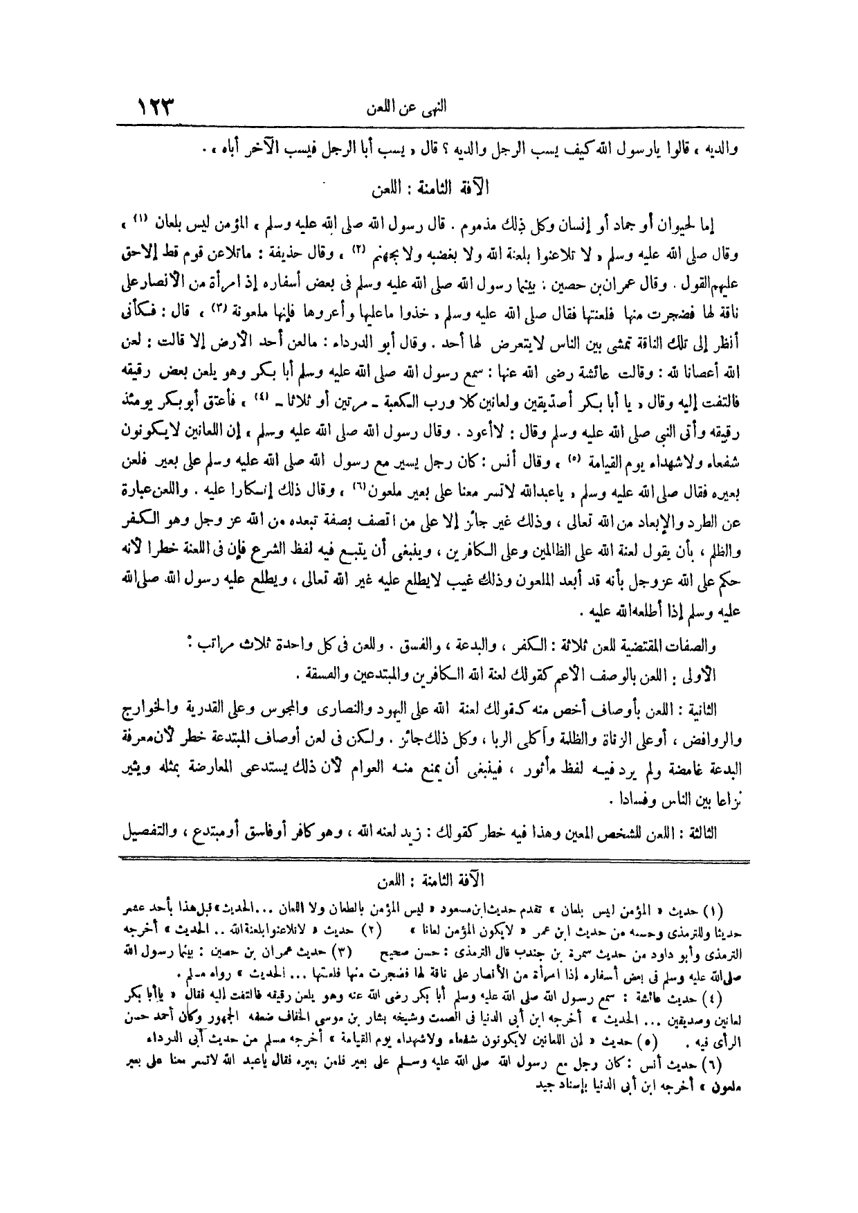 وَالِدَيْهِ قَالُوا يَا رَسُولَ اللَّهِ كَيْفَ يَسُبُّ الرَّجُلُ وَالِدَيْهِ قَالَ يَسُبُّ أَبَا الرَّجُلِ فَيَسُبُّ الآخر أباه الآفة الثامنة اللَّعْنُ