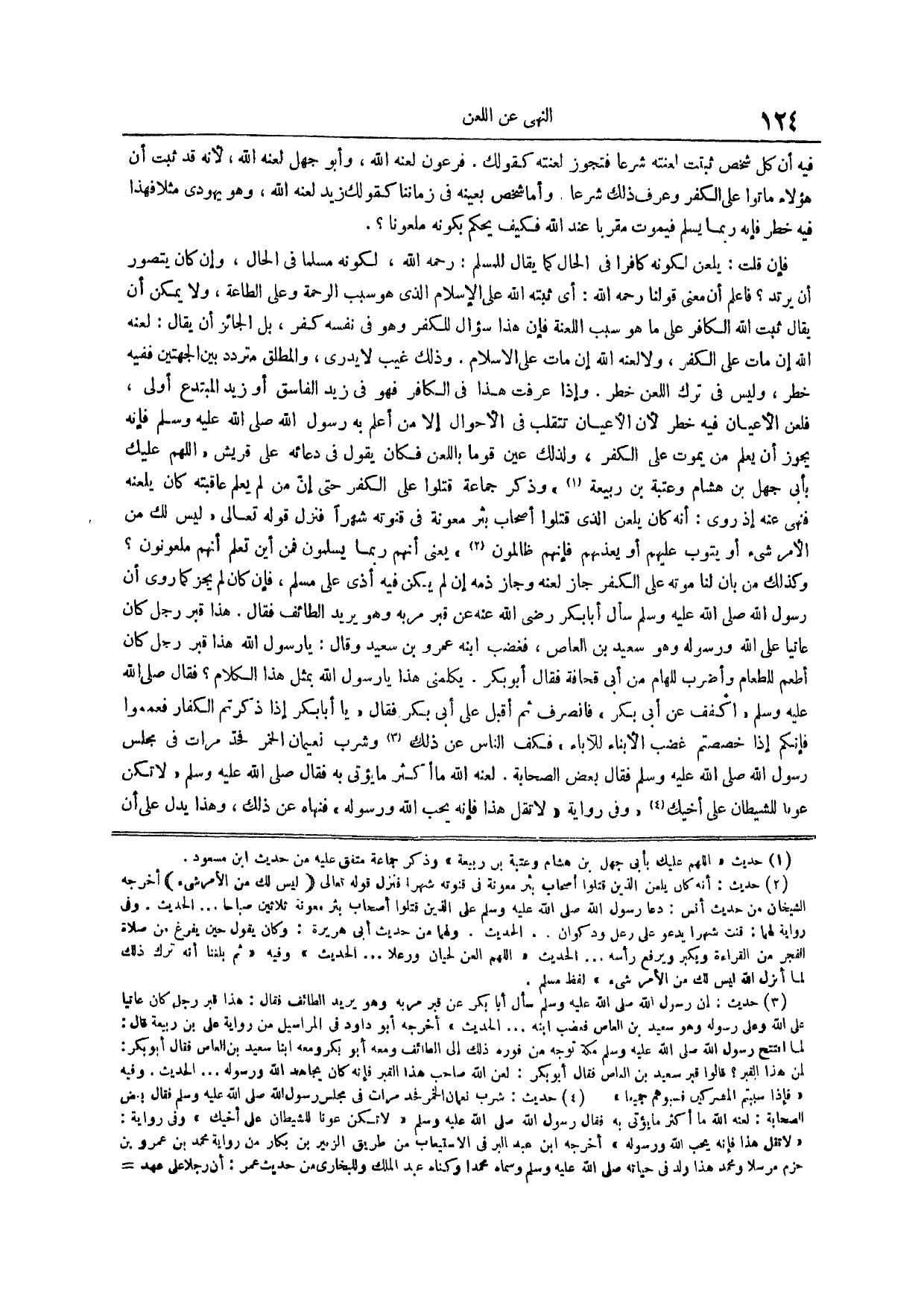يعني أنهم ربما يسلمون فمن أين تعلم أنهم ملعونون وكذلك من بان لنا موته على الكفر جاز لعنه وجاز ذمه إن لم يكن فيه أذى على مسلم فإن كان لم يجز كما رُوِيَ أَنَّ رَسُولَ اللَّهِ صَلَّى اللَّهُ عَلَيْهِ وسلم سأل أبا بكر رضي الله عنه عن قبر مر به وهو يريد الطائف فقال هذا قبر رجل كان عاتياً على الله ورسوله وهو سعيد بن العاص فغضب ابنه عمرو بن سعيد وقال يا رسول الله هذا قبر رجل كان أطعم للطعام وأضرب للهام من أبي قحافة فقال أبو بكر يكلمني هذا يا رسول الله بمثل هذا الكلام فقال صلى الله عليه وسلم اكفف عن أبي بكر فانصرف ثم أقبل على أبي بكر فقال يا أبا بكر إذا ذكرتم الكفار فعمموا فإنكم إذا خصصتم غضب الأبناء للآباء فكف الناس عن ذلك (¬3) حديث شرب نعمان الخمر فحد مرات في مجلس رسول الله صلى الله عليه وسلم فقال بعض الصحابة لعنه الله ما أكثر ما يؤتى به فَقَالَ رَسُولُ اللَّهِ صَلَّى اللَّهُ عَلَيْهِ وَسَلَّمَ لا تكن عوناً للشيطان على أخيك وفي رواية لا تقل هذا فإنه يحب الله ورسوله أخرجه ابن عبد البر في الاستيعاب من طريق الزبير بن بكار من رواية محمد بن عمرو بن حزم مرسلا ومحمد هذا ولد في حياته صلى الله عليه وسلم وسماه محمدا وكناه عبد الملك وللبخاري من حديث عمر أن رجلا عَلَى عَهْدِ رَسُولِ اللَّهِ صَلَّى اللَّهُ عَلَيْهِ وسلم كان اسمه عبد الله وكان يلقب حمارا وكان يضحك رَسُولِ اللَّهِ صَلَّى اللَّهُ عَلَيْهِ وَسَلَّمَ وَكَانَ قد جلده في الشراب فأتي به يوما فأمر به فجلد فقال رجل من القوم اللهم العنه أكثر ما يؤتى به فقال النبي صلى الله عليه وسلم لا تلعنوه فوالله ما علمت إلا أنه يحب الله ورسوله من حديث أبي هريرة في رجل شرب ولم يسم وفيه لا تعينوا عليه الشيطان وفي رواية لا تكونوا عون الشيطان على أخيكم // وفي رواية لا تقل هذا فإنه يحب الله ورسوله فنهاه عن ذلك وهذا يدل على أن