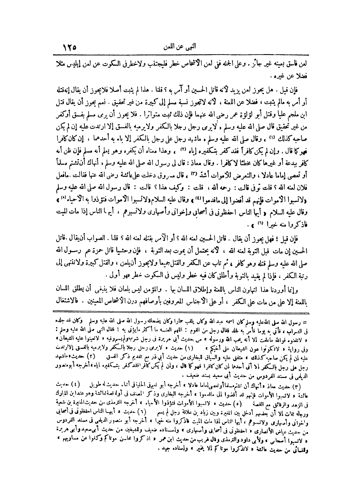 فإن قيل هل يجوز لعن يزيد لأنه قاتل الحسين أو آمر به قلنا هذا لم يثبت أصلاً فلا يجوز أن يقال إنه قتله أو أمر به ما لم يثبت فضلاً عن اللعنة لأنه لا تجوز نسبة مسلم إلى كبيرة من غير تحقيق نعم يجوز أن يقال قتل ابن ملجم علياً وقتل أبو لؤلؤة عمر رضي الله عنهما فإن ذلك ثبت متواتراً فلا يجوز أن يرمى مسلم بفسق أو كفر من غير تحقيق قال صلى الله عليه وسلم لا يرمى رجل رجلاً بالكفر ولا يرميه بالفسق إلا ارتدت عليه إن لم يكن صاحبه كذلك (¬1)