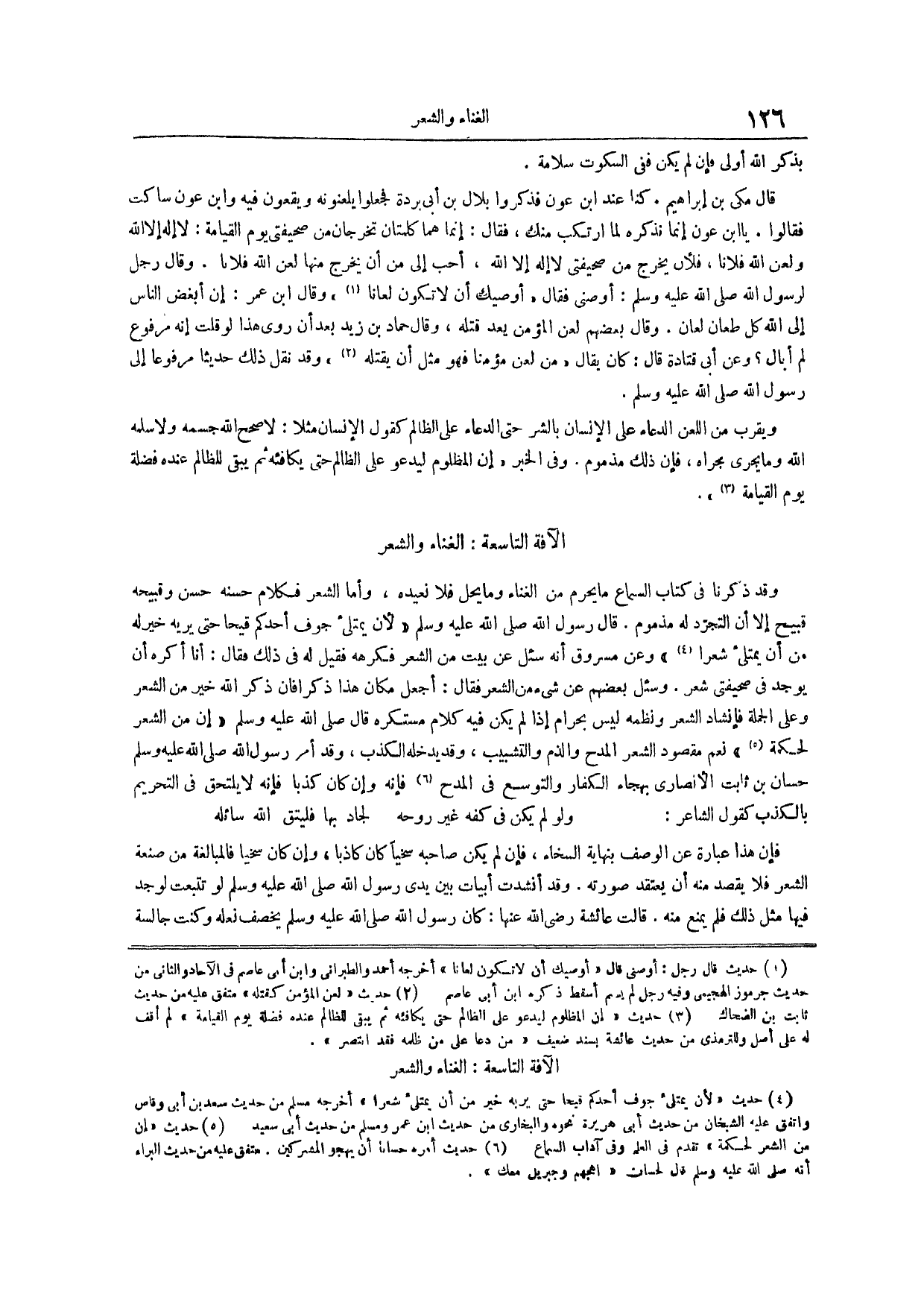 وَيَقْرُبُ مِنَ اللَّعْنِ الدُّعَاءُ عَلَى الْإِنْسَانِ بِالشَّرِّ حتى الدعاء على الظالم كقول الإنسان مثلاً لا صحح الله جسمه ولا سلمه الله وما يجري مجراه فإن ذلك مَذْمُومٌ وَفِي الْخَبَرِ إِنَّ الْمَظْلُومَ لَيَدْعُو عَلَى الظالم حتى يكافئه ثم يبقى للظالم عنده فضلة يوم القيامة (¬3) الآفة التاسعة الغناء والشعر