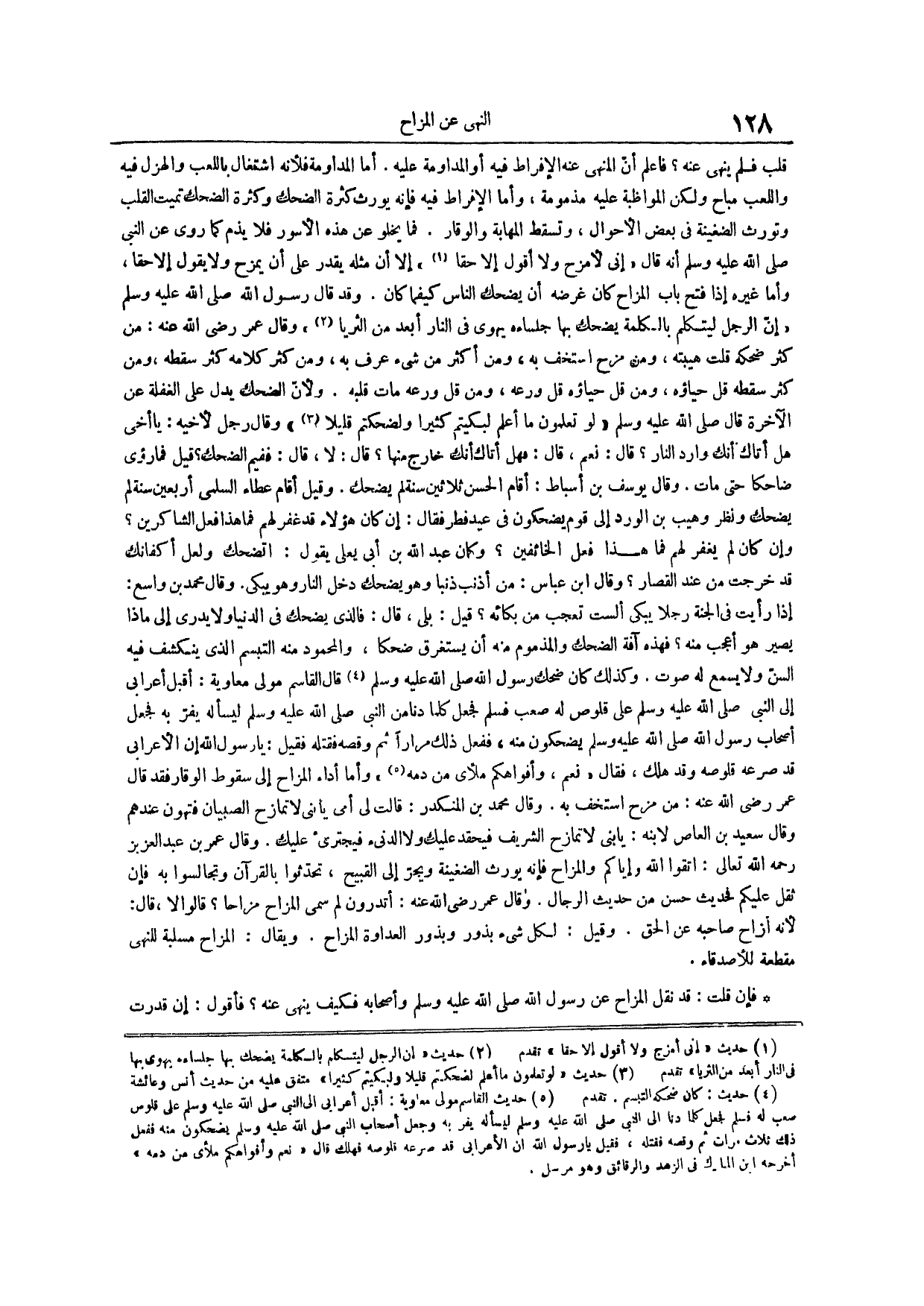 فإن قلت قد نقل المزاح عَنْ رَسُولِ اللَّهِ صَلَّى اللَّهُ عَلَيْهِ وَسَلَّمَ وأصحابه فكيف ينهى عنه فأقول إن قدرت
