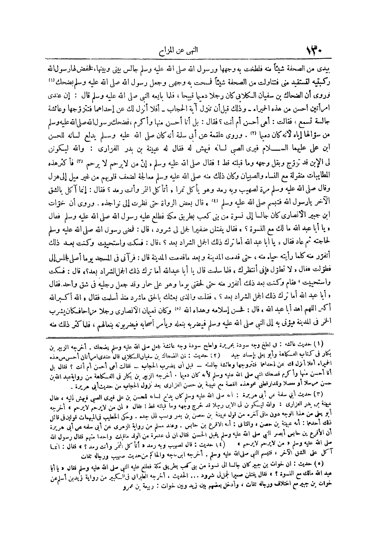 بِيَدِي مِنَ الصَّحْفَةِ شَيْئًا مِنْهُ فَلَطَّخْتُ بِهِ وجههاً ورسول الله صلى الله عليه وسلم جالس بيني وبينها فخفض لها رسول الله ركبتيه لتستقيد مني فَتَنَاوَلَتْ مِنَ الصَّحْفَةِ شَيْئًا فَمَسَحَتْ بِهِ وَجْهِي وَجَعَلَ رَسُولُ اللَّهِ صَلَّى اللَّهُ عَلَيْهِ وَسَلَّمَ يضحك (¬1) وروي أن الضحاك بن سفيان الكلابي كان رجلاً دميماً قبيحاً فلما بايعه النبي صلى الله عليه وسلم قال إن عندي امرأتين أحسن من هذه الحميراء وذلك قبل أن تنزل آية الحجاب أفلا أنزل لك عن إحداهما فتتزوجها وعائشة جالسة تسمع فقالت أهي أحسن أم أنت فقال بل أنا أحسن منها وأكرم فضحك رسول الله صلى الله عليه وسلم من سؤالها إياه لأنه كان دميماً (¬2) وروى علقمة عن أبي سلمة أَنَّهُ كَانَ صَلَّى اللَّهُ عَلَيْهِ وسلم يدلع لسانه للحسن ابن علي عليهما السلام فيرى الصبي لسانه فيهش له فقال له عيينة بن بدر الفزاري وَاللَّهِ لَيَكُونَنَّ لِيَ الِابْنُ قَدْ تَزَوَّجَ وَبَقَلَ وَجْهُهُ وَمَا قَبَّلْتُهُ قَطُّ فَقَالَ صَلَّى اللَّهُ عَلَيْهِ وَسَلَّمَ إِنَّ مَنْ لَا يَرْحَمْ لَا يُرْحَمْ (¬3) فَأَكْثَرُ هَذِهِ الْمُطَايَبَاتِ مَنْقُولَةٌ مَعَ النِّسَاءِ وَالصِّبْيَانِ وَكَانَ ذَلِكَ مِنْهُ صَلَّى اللَّهُ عَلَيْهِ وَسَلَّمَ مُعَالَجَةً لِضَعْفِ قُلُوبِهِمْ مِنْ غَيْرِ مَيْلٍ إِلَى هَزْلٍ وَقَالَ صَلَّى اللَّهُ عَلَيْهِ وَسَلَّمَ مَرَّةً لصهيب وَبِهِ رَمَدٌ وَهُوَ يَأْكُلُ تَمْرًا أَتَأْكُلُ التَّمْرَ وَأَنْتَ رَمِدٌ فَقَالَ إِنَّمَا آكُلُ بِالشِّقِّ الْآخَرِ يَا رَسُولَ اللَّهِ فَتَبَسَّمَ صَلَّى اللَّهُ عَلَيْهِ وَسَلَّمَ (¬4)
