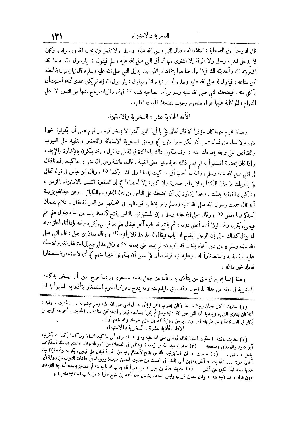 وهذا محرم مهما كان مؤذياً كما قَالَ تَعَالَى يَا أَيُّهَا الَّذِينَ آمَنُوا لَا يَسْخَرْ قَومٌ مِنْ قَوْمٍ عَسَى أَنْ يَكُونُوا خَيْرًا مِنْهُمْ وَلَا نِسَاءٌ مِنْ نِسَاءٍ عَسَى أن يكن خيراً منهن وَمَعْنَى السُّخْرِيَةِ الِاسْتِهَانَةُ وَالتَّحْقِيرُ وَالتَّنْبِيهُ عَلَى الْعُيُوبِ والنقائص عَلَى وَجْهٍ يُضْحَكُ مِنْهُ وَقَدْ يَكُونُ ذَلِكَ بالمحاكاة في الفعل والقول وقد يكون بالإشارة والإيماء وإذا كان بحضرة المستهزأ به لم يسم ذلك غيبة وفيه معنى الغيبة قالت عائشة رضي الله عنها حاكيت إنساناً فقال لي النبي صلى الله عليه وسلم والله ما أحب أني حاكيت إنساناً ولي كذا وكذا (¬2) وقال ابن عباس في قوله تعالى يا ويلتنا ما لهذا الْكِتَابِ لَا يُغَادِرُ صَغِيرَةً وَلَا كَبِيرَةً إِلَّا أحصاها إن الصغيرة التبسم بالاستهزاء بالمؤمن والكبيرة القهقهة بذلك وهذا إشارة إلى أن الضحك على الناس من جملة الذنوب والكبائر وعن عبد الله بن زمعة أنه قال سَمِعْتُ رَسُولَ اللَّهِ صَلَّى اللَّهُ عَلَيْهِ وَسَلَّمَ وهو يخطب فوعظهم في ضحكهم من الضرطة فقال علام يضحك أحدكم مما يفعل (¬3) وقال صلى الله عليه وسلم إن المستهزئين بالناس يفتح لأحدهم باب من الجنة فيقال هلم هلم فيجيء بكربه وغمه فإذا أتاه أغلق دونه ثم يفتح له باب آخر فيقال هلم هلم فيجيء بكربه وغمه فإذا أتاه أغلق دونه فما يزال كذلك حتى إن الرجل ليفتح له الباب فيقال له هلم هلم فلا يأتيه (¬4) وقال معاذ بن جبل قال النبي صلى الله عليه وسلم من عير أخاه بذنب قد تاب منه لم يمت حتى يعمله (¬5) وكل هذا يرجع إلى استحقار الغير والضحك عليه استهانة به واستصغاراً لَهُ وَعَلَيْهِ نَبَّهَ قَوْلُهُ تَعَالَى عَسَى أَنْ يكونوا خيراً منهم أَيْ لَا تَسْتَحْقِرْهُ اسْتِصْغَارًا فَلَعَلَّهُ خَيْرٌ مِنْكَ