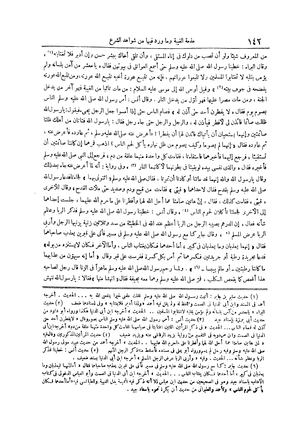 (¬6) حديث جابر كنا مَعَ رَسُولِ اللَّهِ صَلَّى اللَّهُ عَلَيْهِ وَسَلَّمَ في مسير فأتى على قبرين يعذب صاحباهما فقال أما إنهما ليعذبان وما يعذبان في كبير أما أحدهما فكان يغتاب الناس الحديث أخرجه ابن أبي الدنيا في الصمت وأبو العباس الدغولي في كتاب الآداب بإسناد جيد وهو في الصحيحين من حديث ابن عباس إلا أنه ذكر فيه النميمة بدل الغيبة وللطيالسي فيه أما أحدهما فكان يأكل لحوم الناس ولأحمد والطبراني من حديث ابن بكرة نحوه بإسناد جيد