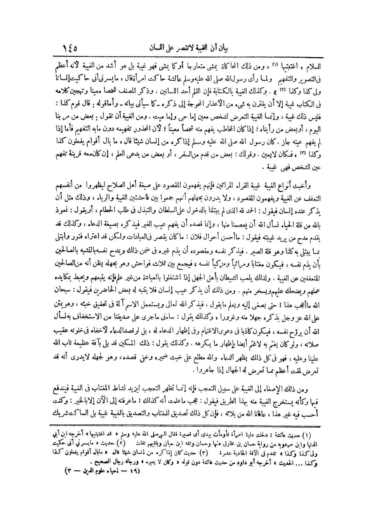 وأخبث أنواع الغيبة غيبة القراء المرائين فإنهم يفهمون المقصود على صيغة أهل الصلاح ليظهروا من أنفسهم التعفف عن الغيبة ويفهمون المقصود ولا يدرون بجهلهم أنهم جمعوا بين فاحشتين الغيبة والرياء وذلك مثل أن يذكر عنده إنسان فيقول الحمد لله الذي لم يبتلنا بالدخول على السلطان والتبذل في طلب الحطام أو يقول نعوذ بالله من قلة الحياء نسأل الله أن يعصمنا منها وإنما قصده أن يفهم عيب الغير فيذكره بصيغة الدعاء وَكَذَلِكَ قَدْ يُقَدِّمُ مَدْحَ مَنْ يُرِيدُ غِيبَتَهُ فيقول ما أحسن أحوال فلان ما كان يقصر في العبادات ولكن قد اعتراه فتور وابتلي بما يبتلي به كلنا وهو قلة الصبر فَيَذْكُرُ نَفْسَهُ وَمَقْصُودُهُ أَنْ يَذُمَّ غَيْرَهُ فِي ضمن ذلك ويمدح نفسه بالتشبه بالصالحين بأن يذم نفسه فيكون مغتاباً ومرائياً ومزكياً نفسه فيجمع بين ثلاث فواحش وهو بجهله يظن أنه من الصالحين المتعففين عن الغيبة ولذلك يلعب الشيطان بأهل الجهل إذا اشتغلوا بالعبادة من غير علم فإنه يتبعهم ويحبط بمكايده عملهم ويضحك عليهم ويسخر منهم وَمِنْ ذَلِكَ أَنْ يَذْكُرَ عَيْبَ إِنْسَانٍ فَلَا يَتَنَبَّهُ لَهُ بَعْضُ الْحَاضِرِينَ فَيَقُولُ سُبْحَانَ اللَّهِ مَا أَعْجَبَ هَذَا حَتَّى يُصْغَى إِلَيْهِ وَيُعْلَمَ ما يقول فيذكر الله تعالى ويستعمل الاسم آلة في تحقيق خبثه وهو يمتن على الله عز وجل بذكره جهلاً منه وغروراً وَكَذَلِكَ يَقُولُ سَاءَنِي مَا جَرَى عَلَى صَدِيقِنَا من الاستخفاف به نسأل الله أن يروح نفسه فيكون كاذباً في دعوى الاغتمام وفي إظهار الدعاء له بل لو قصد الدعاء لأخفاه في خلوته عقيب صلاته ولو كان يغتم به لاغتم أيضاً بِإِظْهَارِ مَا يَكْرَهُهُ وَكَذَلِكَ يَقُولُ ذَلِكَ الْمِسْكِينُ قَدْ بُلِيَ بِآفَةٍ عَظِيمَةٍ تَابَ اللَّهُ عَلَيْنَا وعليه فهو فِي كُلِّ ذَلِكَ يُظْهِرُ الدُّعَاءَ وَاللَّهُ مُطَّلِعٌ عَلَى خُبْثِ ضَمِيرِهِ وَخَفِيِّ قَصْدِهِ وَهُوَ لِجَهْلِهِ لا يدري أنه قد تعرض لمقت أعظم مما تعرض له الجهال إذا جاهروا