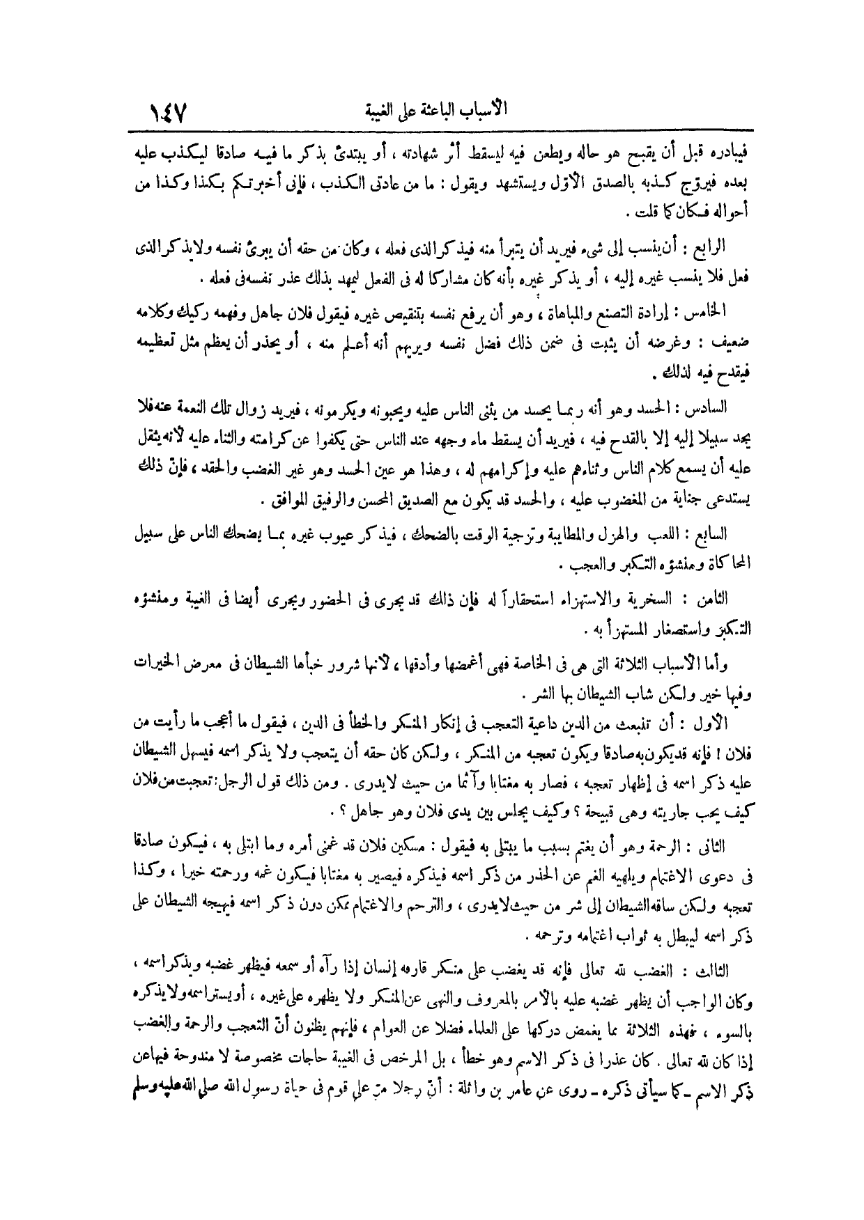 الخامس إِرَادَةُ التَّصَنُّعِ وَالْمُبَاهَاةِ وَهُوَ أَنْ يَرْفَعَ نَفْسَهُ بتنقيص غيره فيقول فلان جاهل وفهمه ركيك وكلامه ضعيف وغرضه أن يثبت في ضمن ذلك فضل نفسه ويريهم أنه أعلم منه أو يحذر أن يعظم مثل تعظيمه فيقدح فيه لذلك