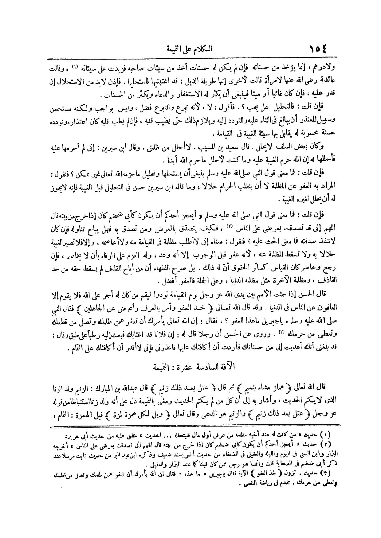 فإن قلت فما معنى قول النبي صلى الله عليه وسلم أَيَعْجِزُ أَحَدُكُمْ أَنْ يَكُونَ كأبي ضمضم كَانَ إِذَا خَرَجَ مِنْ بَيْتِهِ قَالَ اللَّهُمَّ إِنِّي قد تصدقت بعرضي على الناس (¬2) حديث نزول {خذ العفو} الآية فقال يا جبريل {ما هذا} فقال إن الله يَأْمُرُكَ أَنْ تَعْفُوَ عَمَّنْ ظَلَمَكَ وَتَصِلَ مَنْ قطعك وتعطي من حرمك تقدم في رياضة النفس // وروي عن الحسن أن رجلاً قال له إن فلانا قد اغتابك فعبث إليه رطباً على طبق وقال قد بلغني أنك أهديت إلي من حسناتك فأردت أن أكافئك عليها فاعذرني فإني لا أقدر أن أكافئك على التمام الْآفَةُ السَّادِسَةَ عَشْرَةَ النَّمِيمَةُ