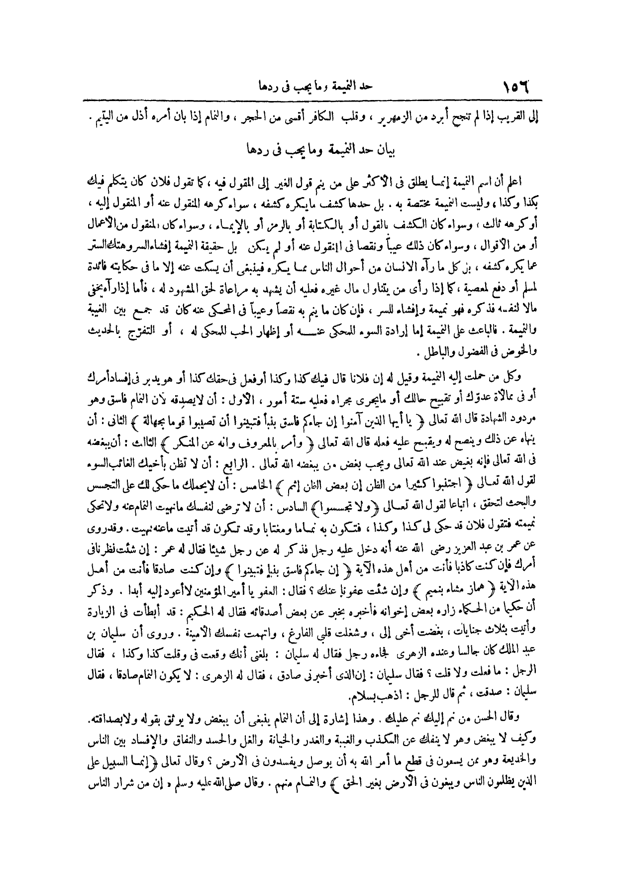 السادس أن لا ترضى لنفسك ما نهيت النمام عنه ولا تحكي نميمته فتقول فلان قد حكى لي كذا وكذا فتكون به نماماً ومغتاباً وقد تكون قد أتيت ما عنه نهيت وقد روي عن عمر بن عبد العزيز رضي الله عنه أنه دخل عليه رجل فذكر له عن رجل شيئاً فقال له عمر إن شئت نظر نافي أمرك فإن كنت كاذباً فأنت من أهل هذه الآية {إن جاءكم فاسق بنبأ فتبينوا} وإن كنت صادقاً فأنت من أهل هذه الآية {هماز مشاء بنميم} وإن شئت عفونا عنك فقال العفو يا أمير المؤمنين لا أعود إليه أبداً وذكر أن حكيماً من الحكماء زاره بعض إخوانه فأخبره بخبر عن بعض أصدقائه فقال له الحكيم قد أبطأت في الزيارة وأتيت بثلاث جنايات بغضت أخي إلي وشغلت قلبي الفارغ واتهمت نفسك الأمينة وروي أن سليمان بن عبد الملك كان جالساً وعنده الزهري فجاءه رجل فقال له سليمان بلغني أنك وقعت في وقلت كذا وكذا فقال الرجل ما فعلت ولا قلت فقال سليمان إن الذي أخبرني صادق فقال له الزهري لا يكون النمام صادقاً فقال سليمان صدقت ثم قال للرجل اذهب بسلام