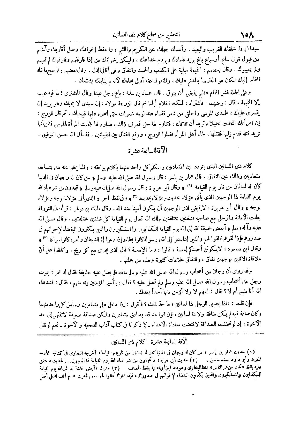 (¬1) حديث عمار بن ياسر من كان له وجهان في الدنيا كان له لسانان من نار يوم القيامة أخرجه البخاري في كتاب الأدب المفرد وأبو داود بسند حسن