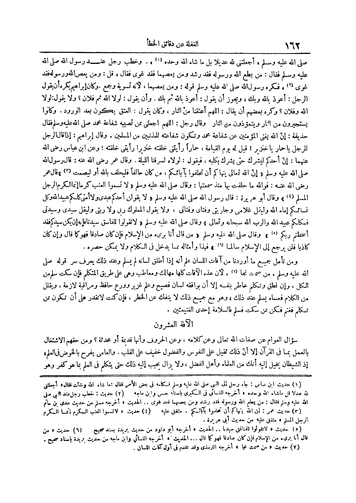 لأن هذه الآفات كلها مهالك ومعاطب وهي على طريق المتكلم فإن سكت سلم من الكل وإن نطق وتكلم خاطر بنفسه إلا أن يوافقه لسان فصيح وعلم غزير وورع حافظ ومراقبة لازمة ويقلل من الكلام فعساه يسلم عند ذلك وهو مع جميع ذلك لا ينفك عن الخطر فإن كنت لا تقدر على أن تكون ممن تكلم فغنم فكن ممن سكت فسلم فالسلامة إحدى الغنيمتين الآفة العشرون