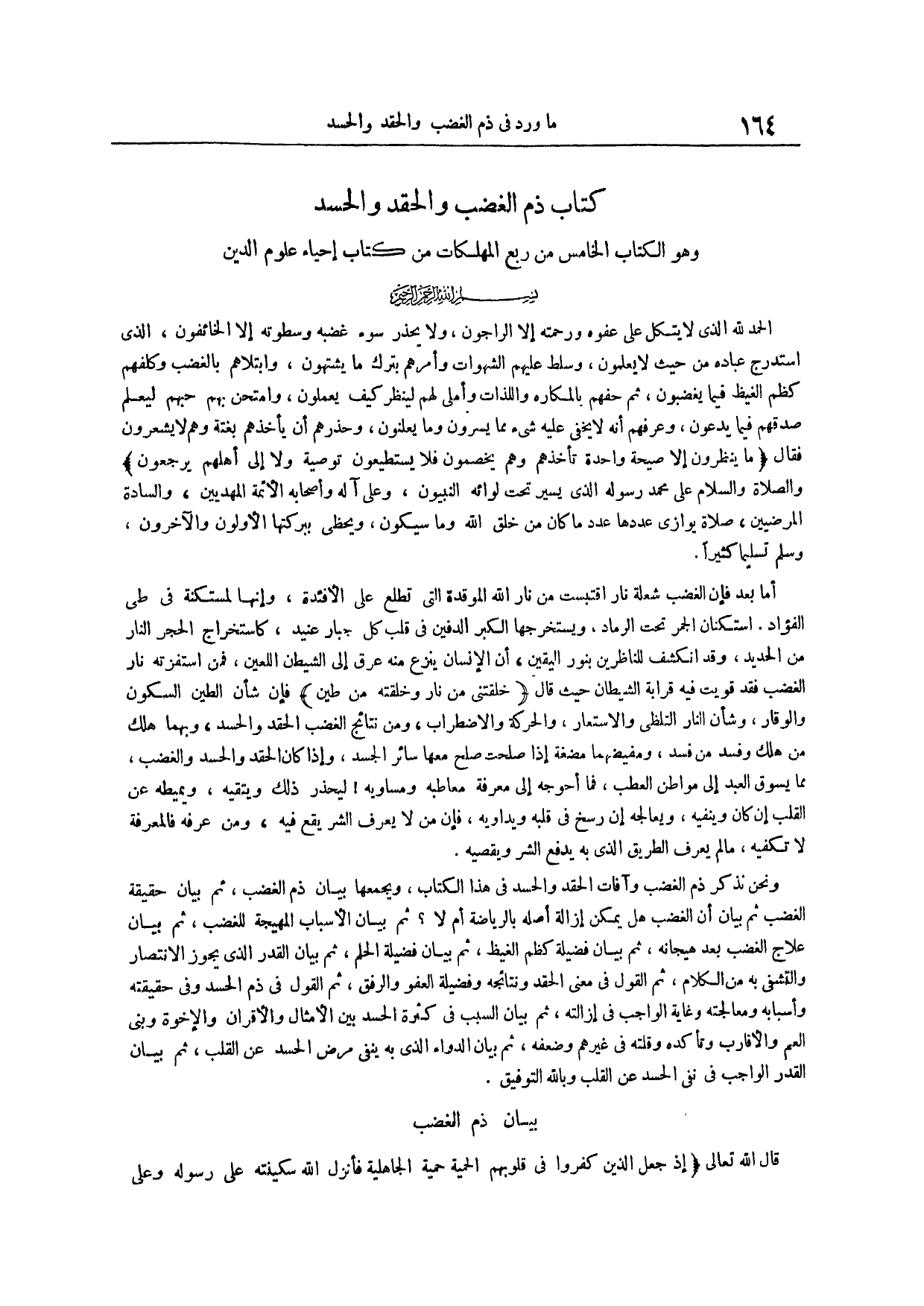 أما بعد فإن الْغَضَبَ شُعْلَةُ نَارٍ اقْتُبِسَتْ مِنْ نَارِ اللَّهِ الموقدة التي تطلع على الْأَفْئِدَةَ وَإِنَّهَا لَمُسْتَكِنَّةٌ فِي طَيِّ الْفُؤَادِ اسْتِكْنَانَ الجمر تحت الرماد ويستخرجه الْكِبْرُ الدَّفِينُ فِي قَلْبِ كُلِّ جَبَّارٍ عَنِيدٍ كَاسْتِخْرَاجِ الْحَجَرِ النَّارَ مِنَ الْحَدِيدِ وَقَدِ انْكَشَفَ لِلنَّاظِرِينَ بِنُورِ الْيَقِينِ أَنَّ الْإِنْسَانَ يَنْزِعُ مِنْهُ عِرْقٌ إِلَى الشَّيْطَانِ اللَّعِينِ فَمَنِ اسْتَفَزَّتْهُ نَارُ الْغَضَبِ فَقَدْ قَوِيَتْ فِيهِ قَرَابَةُ الشَّيْطَانِ حَيْثُ قَالَ {خَلَقْتَنِي مِنْ نَارٍ وَخَلَقْتَهُ مِنْ طِينٍ} فَإِنَّ شَأْنَ الطِّينِ السُّكُونُ وَالْوَقَارُ وَشَأْنَ النَّارِ التَّلَظِّي وَالِاسْتِعَارُ وَالْحَرَكَةُ وَالِاضْطِرَابُ وَمِنْ نَتَائِجِ الْغَضَبِ الْحِقْدُ وَالْحَسَدُ وَبِهِمَا هَلَكَ مَنْ هَلَكَ وَفَسَدَ مَنْ فَسَدَ وَمُفِيضُهُمَا مُضْغَةٌ إِذَا صَلَحَتْ صَلَحَ معها سائر الْجَسَدُ وَإِذَا كَانَ الْحِقْدُ وَالْحَسَدُ وَالْغَضَبُ مِمَّا يَسُوقُ الْعَبْدَ إِلَى مُوَاطِنِ الْعَطَبِ فَمَا أَحْوَجَهُ إلى معرفة معاطبه ومساويه لِيَحْذَرَ ذَلِكَ وَيَتَّقِيَهُ وَيُمِيطَهُ عَنِ الْقَلْبِ إِنْ كان وينفيه ويعالجه إن رسخ في قلبه ويداويه فإن من لا يعرف الشر يقع فيه ومن عرفه فالمعرفة لا تكفيه ما لم يعرف الطريق الذي به يدفع الشر ويقصيه