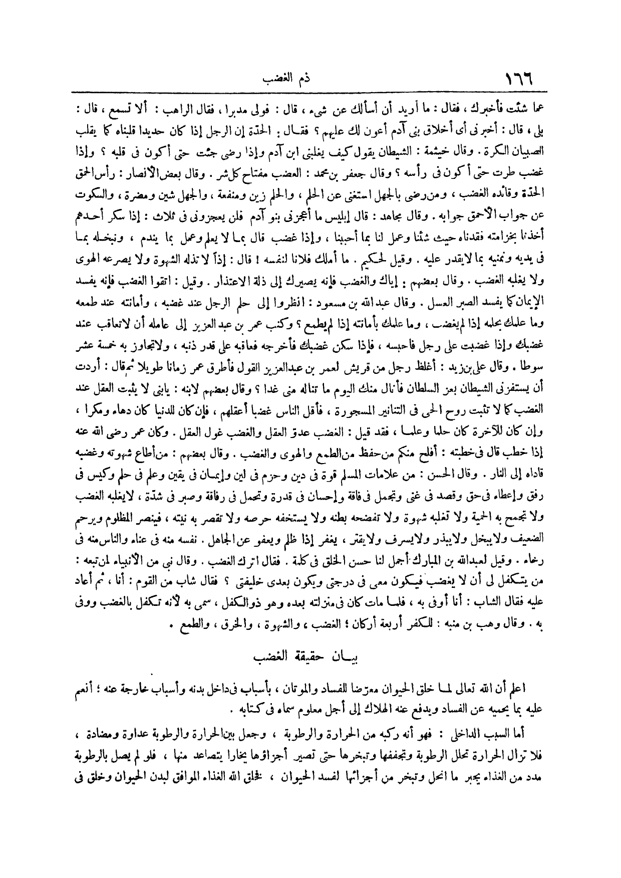 وقال خيثمة الشيطان يقول كيف يغلبني ابن آدم وإذا رضي جئت حتى أكون في قلبه وإذا غضب طرت حتى أكون في رأسه وقال جعفر بن محمد الْغَضَبُ مِفْتَاحُ كُلِّ شَرٍّ وَقَالَ بَعْضُ الْأَنْصَارِ رَأْسُ الْحُمْقِ الْحِدَّةُ وَقَائِدُهُ الْغَضَبُ وَمَنْ رَضِيَ بِالْجَهْلِ اسْتَغْنَى عَنِ الْحِلْمِ وَالْحِلْمُ زَيْنٌ وَمَنْفَعَةٌ وَالْجَهْلُ شَيْنٌ وَمَضَرَّةٌ وَالسُّكُوتُ عَنْ جَوَابِ الْأَحْمَقِ جوابه وقال مجاهد قال إبليس ما أعجزني بنو آدم فلن يعجزوني في ثلاث إذا سكر أحدهم أخذنا بخزامته فقدناه حيث شئنا وعمل لنا بما أحببنا وإذا غضب قال بما لا يعلم وعمل بما يندم ونبخله بما في يديه ونمنيه بما لا يقدر عليه وقيل لحكيم ما أملك فلاناً لنفسه قال إذاً لا تذله الشهوة ولا يصرعه الهوى ولا يغلبه الغضب وقال بعضهم إياك والغضب فإنه يصيرك إلى ذلة الاعتذار وقيل اتقوا الغضب فإنه يفسد الإيمان كما يفسد الصبر العسل وقال عبد الله بن مسعود انظروا إلى حلم الرجل عند غضبه وأمانته عند طمعه وما علمك بحلمه إذا لم يغضب وما علمك بأمانته إذا لم يطمع وكتب عمر بن عبد العزيز إلى عامله أن لا تعاقب عند غضبك وإذا غضبت على رجل فأحبسه فإذا سكن غضبك فأخرجه فعاقبه على قدر ذنبه ولا تجاوز به خمسة عشر سوطاً
