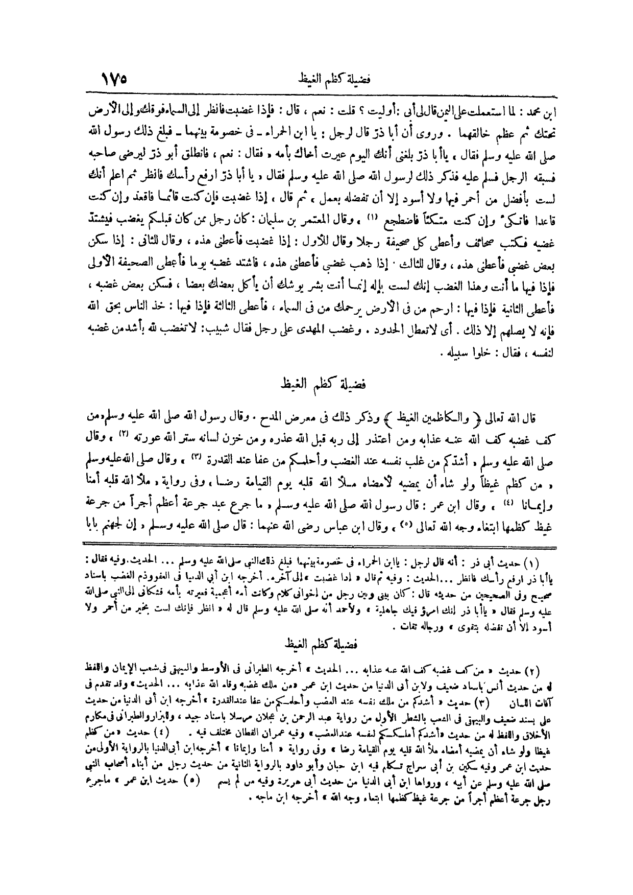 (¬1) حديث أبي ذر أنه قال لرجل يا ابن الحمراء في خصومة بينهما فبلغ ذلك النبي صلى الله عليه وسلم الحديث وفيه فقال يا أبا ذر ارفع رأسك فانظر الحديث وفيه ثم قال إذا غضبت إلى آخره أخرجه ابن أبي الدنيا في العفو وذم الغضب بإسناد صحيح وفي الصحيحين من حديثه قال كان بيني وبين رجل من إخواني كلام وكانت أمه أعجمية فعيرته بأمه فشاكني إلى النبي صلى الله عليه وسلم فقال يا أبا ذر إنك امرؤ فيك جاهلية ولأحمد أنه صلى الله عليه وسلم قال له انظر فإنك لست بخير من أحمر ولا أسود إلا أن تفضله بتقوى ورجاله ثقات
