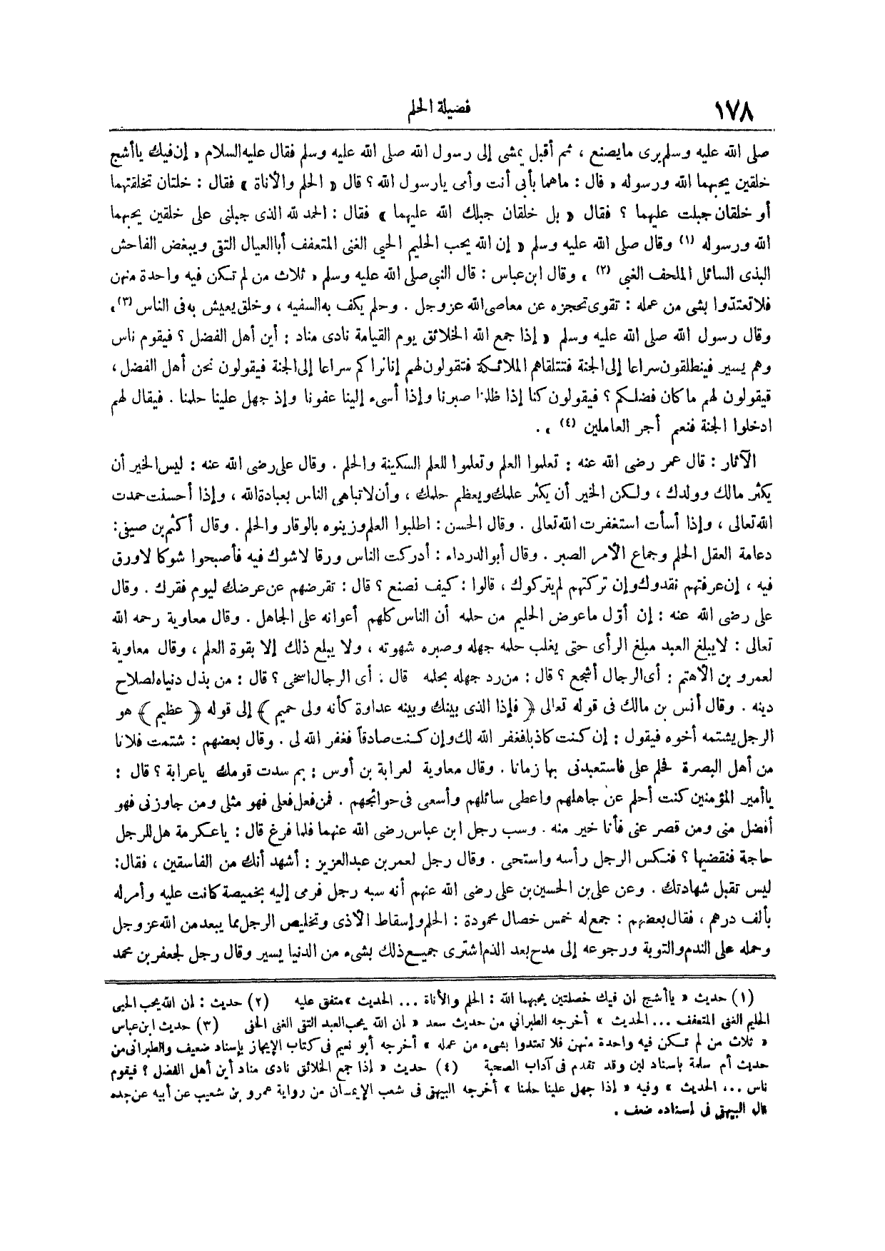 الآثار قال عمر رضي الله عنه تعلموا العلم وتعلموا للعلم السكينة والحلم وقال علي رَضِيَ اللَّهُ عَنْهُ لَيْسَ الْخَيْرُ أَنْ يَكْثُرَ مَالُكَ وَوَلَدُكَ وَلَكِنَّ الْخَيْرَ أَنْ يَكْثُرَ عِلْمُكَ وَيَعْظُمَ حِلْمُكَ وَأَنْ لَا تُبَاهِيَ النَّاسَ بِعِبَادَةِ اللَّهِ وَإِذَا أَحْسَنْتَ حَمِدْتَ اللَّهَ تَعَالَى وإذا أسأت استغفرت الله تعالى وقال الحسن اطلبوا العلم وزينوه بالوقار والحلم وقال أكثم بن صيفي دِعَامَةُ الْعَقْلِ الْحِلْمُ وَجِمَاعُ الْأَمْرِ الصَّبْرُ وَقَالَ أبو الدرداء أدركت الناس ورقا لا شوك فيه فأصبحوا شوكاً لا ورق فيه إن عرفتهم نقدوك وإن تركتهم لم يتركوك قالوا كيف نصنع قال تقرضهم عن عرضك ليوم فقرك وقال علي رضي الله عنه أن أول ما عوض الحليم من حلمه أن الناس كلهم أعوانه على الجاهل وقال معاوية رحمه الله تعالى لَا يَبْلُغُ الْعَبْدُ مَبْلَغَ الرَّأْيِ حَتَّى يَغْلِبَ حِلْمُهُ جَهْلَهُ وَصَبْرُهُ شَهْوَتَهُ وَلَا يَبْلُغُ ذَلِكَ إِلَّا بِقُوَّةِ الْعِلْمِ وَقَالَ معاوية لعمرو بن الأهتم أَيُّ الرِّجَالِ أَشْجَعُ قَالَ مَنْ رَدَّ جَهْلَهُ بِحِلْمِهِ قَالَ أَيُّ الرِّجَالِ أَسْخَى قَالَ من بذل دنياه لصلاح دينه وَقَالَ أَنَسُ بْنُ مَالِكٍ فِي قَوْلِهِ تَعَالَى {فَإِذَا الَّذِي بَيْنَكَ وَبَيْنَهُ عَدَاوَةٌ كَأَنَّهُ وَلِيٌّ حميم} إلى قوله {عظيم} هُوَ الرَّجُلُ يَشْتُمُهُ أَخُوهُ فَيَقُولُ إِنْ كُنْتَ كَاذِبًا فَغَفَرَ اللَّهُ لَكَ وَإِنْ كُنْتَ صَادِقًا فغفر الله لي وقال بعضهم شتمت فلاناً من أهل البصرة فحلم علي فاستعبدني بها زماناً وقال معاوية لعرابة بن أوس بم سدت قومك يا عرابة قال يا أمير المؤمنين كُنْتُ أَحْلُمُ عَنْ جَاهِلِهِمْ وَأُعْطِي سَائِلَهُمْ وَأَسْعَى في حوائجهم فمن فعل فِعْلِي فَهُوَ مِثْلِي وَمَنْ جَاوَزَنِي فَهُوَ أَفْضَلُ مِنِّي وَمَنْ قَصَّرَ عَنِّي فَأَنَا خَيْرٌ مِنْهُ وسب رجل ابن عباس رضي الله عنهما فلما فرغ قال يا عكرمة هل للرجل حاجة فنقضيها فنكس الرجل رأسه واستحى وقال رجل لعمر بن عبد العزيز أشهد أنك من الفاسقين فقال ليس تقبل شهادتك وعن علي بن الحسين بن علي رضي الله عنهم أَنَّهُ سَبَّهُ رَجُلٌ فَرَمَى إِلَيْهِ بِخَمِيصَةٍ كَانَتْ عَلَيْهِ وَأَمَرَ لَهُ بِأَلْفِ دِرْهَمٍ فَقَالَ بَعْضُهُمْ جَمَعَ لَهُ خَمْسَ خِصَالٍ مَحْمُودَةٍ الْحِلْمُ وَإِسْقَاطُ الأذى وتخليص الرجل مما يبعد مِنَ اللَّهِ عَزَّ وَجَلَّ وَحَمْلُهُ عَلَى النَّدَمِ والتوبة ورجوعه إلى مدح بَعْدَ الذَّمِّ اشْتَرَى جَمِيعَ ذَلِكَ بِشَيْءٍ مِنَ الدنيا يسير وقال رجل لجعفر بن محمد