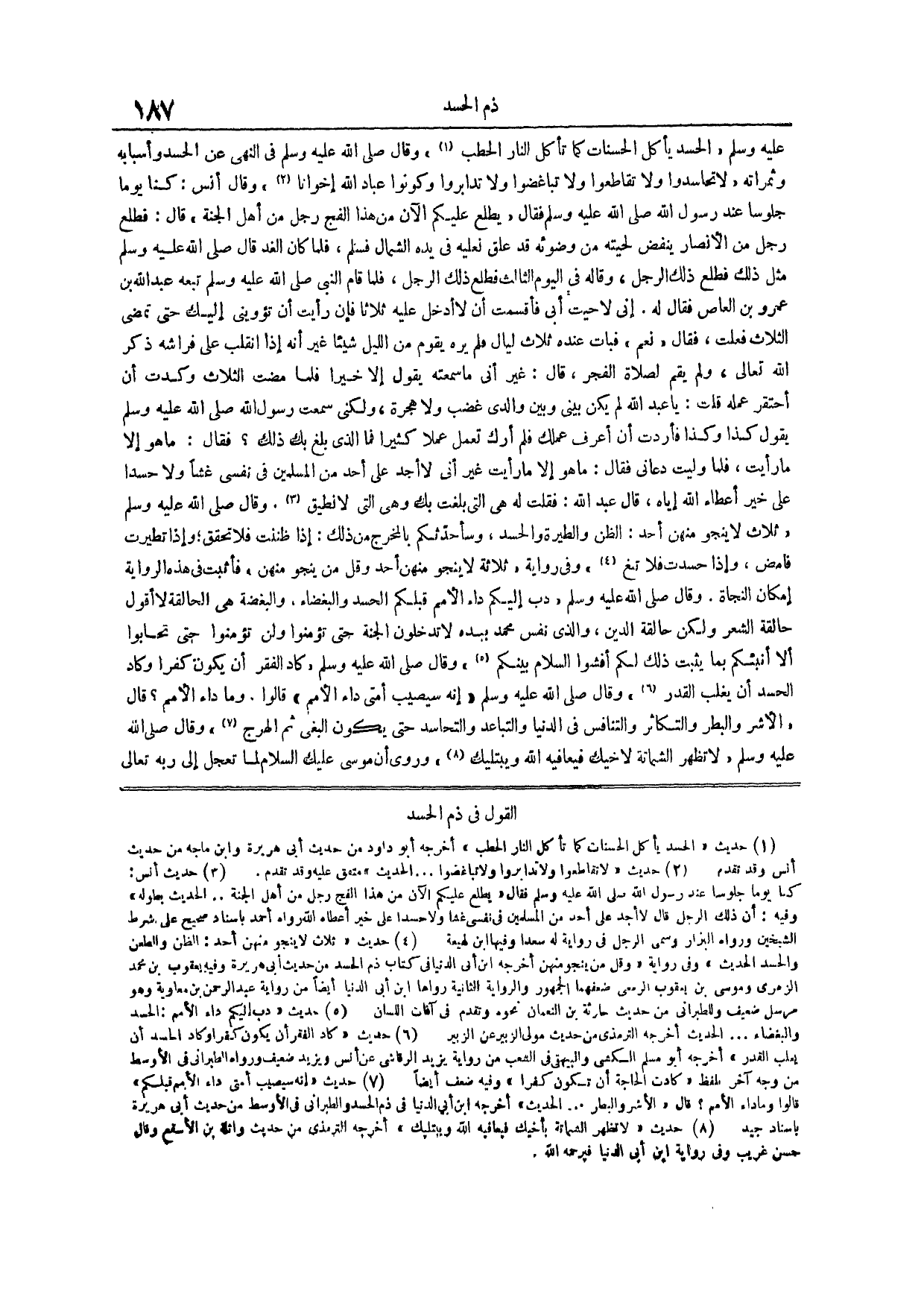 (¬1) حديث الْحَسَدُ يَأْكُلُ الْحَسَنَاتِ كَمَا تَأْكُلُ النَّارُ الْحَطَبَ أخرجه أبو داود من حديث أبي هريرة وابن ماجه من حديث أنس وقد تقدم وقال صلى الله عليه وسلم في النهي عن الحسد وأسبابه وثمراته لَا تَحَاسَدُوا وَلَا تَقَاطَعُوا وَلَا تَبَاغَضُوا وَلَا تدابروا وكونوا عباد الله إخواناً