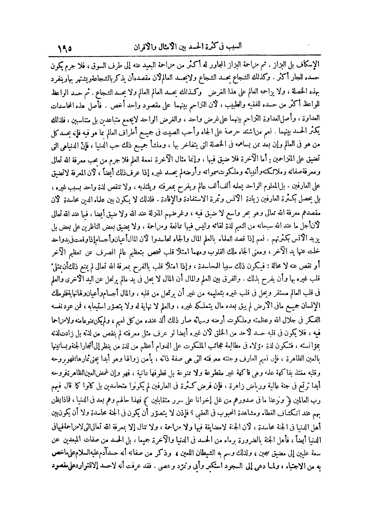الإسكاف بل البزاز ثم مزاحمة البزاز المجاور له أكثر من مزاحمة البعيد عنه إلى طرف السوق فلا جرم يكون حسده للجار أكثر وكذلك الشجاع يحسد الشجاع ولا يحسد العالم لأن مقصده أن يذكر بالشجاعة ويشتهر بها وينفرد بهذه الخصلة ولا يزاحمه العالم على هذا الغرض وكذلك يحسد العالم العالم ولا يحسد الشجاع ثم حسد الواعظ للواعظ أكثر من حسده للفقيه والطبيب لأن التزاحم بينهما على مقصود واحد أخص فأصل هذه المحاسدات العداوة وأصل العداوة التزاحم بينهما على غرض واحد والغرض الواحد لا يجمع متباعدين بل متناسبين فلذلك يكثر الحسد بينهما نعم من اشتد حرصه على الجاه وأحب الصيت في جميع أطراف العالم بما هو فيه فإنه يحسد كل من هو في العالم وإن بعد ممن يساهمه في الخصلة التي يتفاخر بها ومنشأ جميع ذلك حب الدنيا فإن الدنيا هي التي تضيق على المتزاحمين أما الآخرة فلا ضيق فيها وإنما مثال الآخرة نعمة العلم فلا جرم من يحب معرفة الله تعالى ومعرفة صفاته وملائكته وأنبيائه وملكوت سمواته وأرضه لم يحسد غيره إذا عرف ذلك أيضاً لأن المعرفة لا تضيق على العارفين بل المعلوم الواحد يعلمه ألف ألف عالم ويفرح بمعرفته ويلتذ به ولا تنقص لذة واحد بسبب غيره بل يحصل بكثرة العارفين زيادة الأنس وثمرة الاستفادة والإفادة فلذلك لا يكون بين علماء الدين محاسدة لأن مقصدهم معرفة الله تعالى وهو بحر واسع لا ضيق فيه وغرضهم المنزلة عند الله ولا ضيق أيضاً فيما عند الله تعالى لأن أجل ما عند الله سبحانه من النعيم لذة لقائه وليس فيها ممانعة ومزاحمة ولا يضيق بعض الناظرين على بعض بل يزيد الأنس بكثرتهم نعم إذا قصد العلماء بالعلم المال والجاه تحاسدوا لأن المال أعيان وأجسام إذا وقعت في يد واحد خلت عنها يد الآخر ومعنى الجاه ملك القلوب ومهما امتلأ قلب شخص بتعظيم عالم انصرف عن تعظيم الآخر أو نقص عنه لا محالة فيكون ذلك سبباً للمحاسدة وإذا امتلأ قلب بالفرح بمعرفة الله تعالى لم يمنع ذلك أن يمتليء قلب غيره بها وأن يفرح بذلك والفرق بين العلم والمال أن المال لا يحل في يد ما لم يرتحل عن اليد الأخرى والعلم في قلب العالم مستقر ويحل في قلب غيره بتعليمه من غير أن يرتحل من قلبه والمال أجسام وأعيان ولها نهاية فلو ملك الإنسان جميع ما في الأرض لم يبق بعده مال يتملكه غيره والعلم لا نهاية له ولا يتصور استيعابه فمن عود نفسه الفكر في جلال الله وعظمته وملكوت أرضه وسمائه صار ذلك ألذ عنده من كل نعيم ولم يكن ممنوعاً منه ولا مزاحماً فيه فلا يكون في قلبه حسد لأحد من الخلق لأن غيره أيضاً لو عرف مثل معرفته لم ينقص من لذته بل زادت لذته بمؤانسته فتكون لذة هؤلاء في مطالعة عجائب الملكوت على الدوام أعظم من لذة من ينظر إلى أشجار الجنة وبساتينها بالعين الظاهرة فإن نعيم العارف وجنته معرفته التي هي صفة ذاته يأمن زوالها وهو أبداً يجني ثمارها فهو بروحه وقلبه مغتذ بفاكهة علمه وهي فاكهة غير مقطوعة ولا ممنوعة بل قطوفها دانية فهو وإن غمض العين الظاهرة فروحه أبداً ترتع في جنة عالية ورياض زاهرة فإن فرض كثرة في العارفين لم يكونوا متحاسدين بل كانوا كما قال فيهم رب العالمين ونزعنا ما في صدورهم من غل إخوانا على سرر متقابلين فهذا حالهم وهم بعد في الدنيا فماذا يظن بهم عند انكشاف الغطاء ومشاهدة المحبوب في العقبى فإذن لا يتصور أن يكون في الجنة محاسدة ولا أن يكون بين أهل الدنيا في الجنة محاسدة لأن الجنة لا مضايقة فيها ولا مزاحمة ولا تنال إلا بمعرفة الله تعالى التي لا مزاحمة فيها في الدنيا أيضاً فأهل الجنة بالضرورة برءاء من الحسد في الدنيا والآخرة جميعاً بل الحسد من صفات المبعدين عن سعة عليين إلى مضيق سجين ولذلك وسم به الشيطان اللعين وذكر من صفاته أنه حسد آدم عليه السلام على ما خص به من الاجتباء ولما دعى إلى السجود استكبر وأبى وتمرد وعصى فقد عرفت أنه لا حسد إلا للتوارد على مقصود