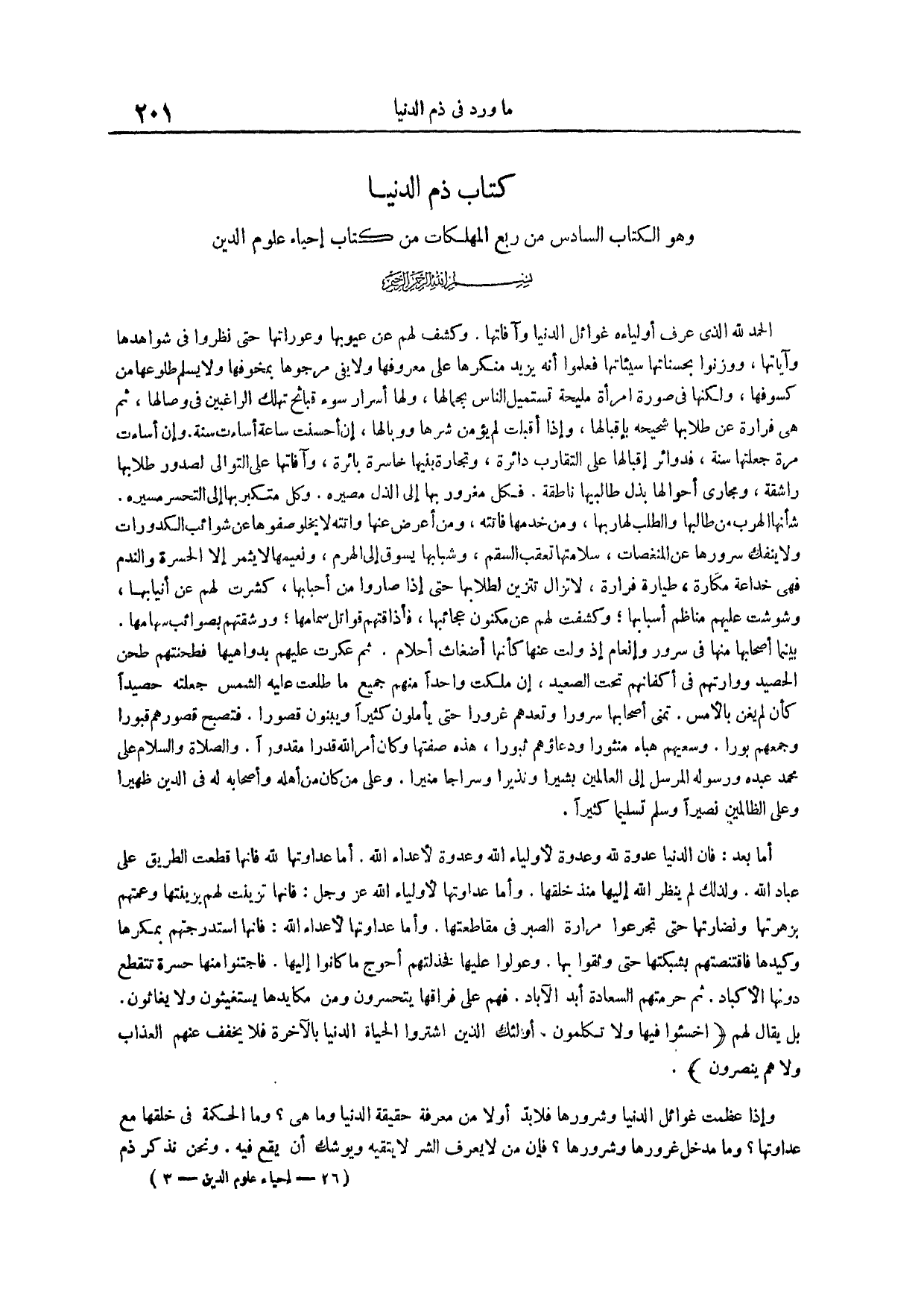 كتاب ذم الدنيا وهو الكتاب السادس من ربع المهلكات من كتاب إحياء