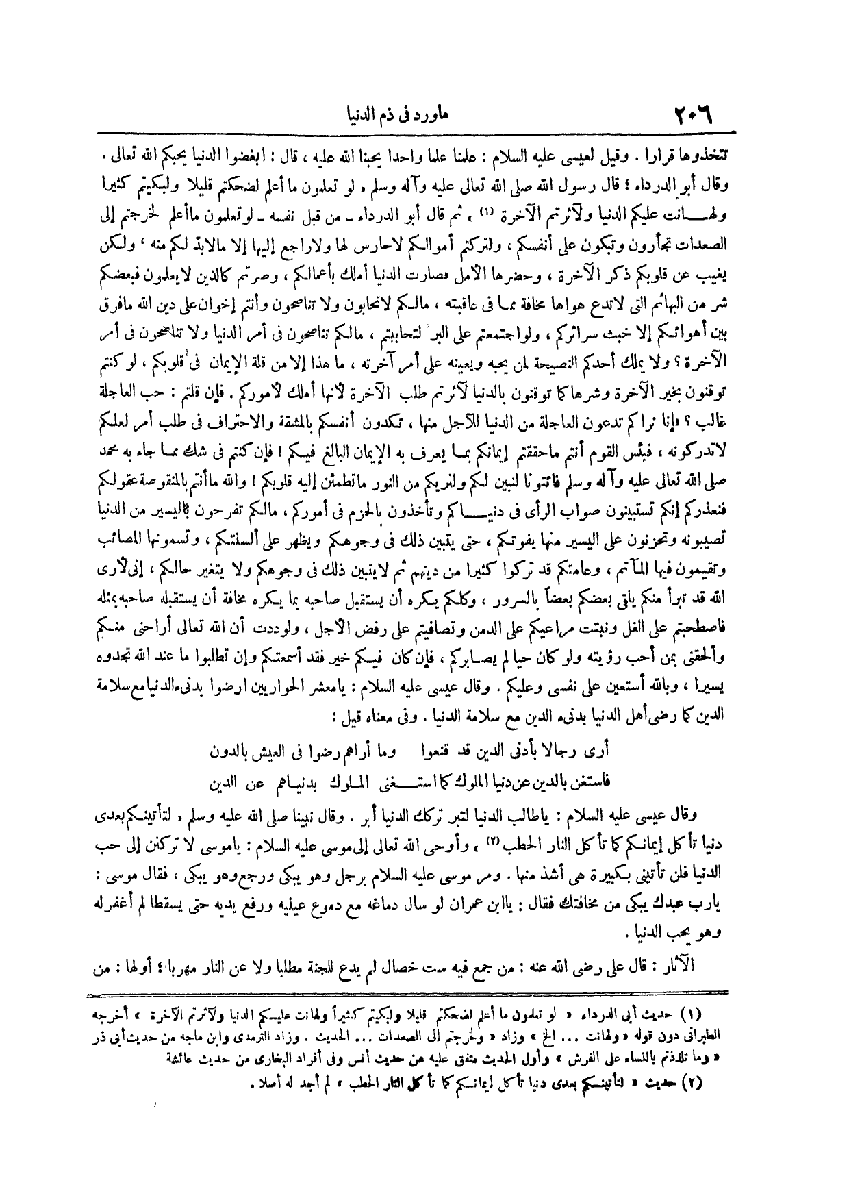 تتخذوها قراراً وقيل لعيسى عليه السلام علمنا علما واحداً يحبنا الله عليه قال ابغضوا الدنيا يحبكم الله تعالى وقال أبو الدرداء قَالَ رَسُولُ اللَّهِ صَلَّى اللَّهُ عَلَيْهِ وَسَلَّمَ لو تعلمون ما أعلم لضحكتم قليلاً ولبكيتم كثيراً ولهانت عليكم الدنيا ولآثرتم الآخرة (¬1) ثم قال أبو الدرداء من قبل نفسه لو تعلمون ما أعلم لخرجتم إلى الصعدات تجأرون وتبكون على أنفسكم ولتركتم أموالكم لا حارس لها ولا راجع إليها إلا ما لابد لكم منه ولكن يغيب عن قلوبكم ذكر الآخرة وحضرها الأمل فصارت الدنيا أملك بأعمالكم وصرتم كالذين لا يعلمون فبعضكم شر من البهائم التي لا تدع هواها مخافة مما في عاقبته ما لكم لا تحابون ولا تناصحون وأنتم إخوان على دين الله ما فرق بين أهوائكم إلا خبث سرائركم ولو اجتمعتم على البر لتحاببتم ما لكم تناصحون في أمر الدنيا ولا تناصحون في أمر الآخرة ولا يملك أحدكم النصيحة لمن يحبه ويعينه على أمر آخرته ما هذا إلا من قلة الإيمان في قلوبكم لو كنتم توقنون بخير الآخرة وشرها كما توقنون بالدنيا لآثرتم طلب الآخرة لأنها أملك لأموركم فإن قلتم حب العاجلة غالب فإنا نراكم تدعون العاجلة من الدنيا للآجل منها تكدون أنفسكم بالمشقة والاحتراف في طلب أمر لعلكم لا تدركونه فبئس القوم أنتم ما حققتم إيمانكم بما يعرف به الإيمان البالغ فيكم فإن كنتم في شك مما جاء به محمد صلى الله عليه وسلم فائتونا لنبين لكم ولنريكم من النور ما تطمئن إليه قلوبكم والله ما أنتم بالمنقوصة عقولكم فنعذركم إنكم تستبينون صواب الرأي في دنياكم وتأخذون بالحزم في أموركم ما لكم تفرحون باليسير من الدنيا تصيبونه وتحزنون على اليسير منها يفوتكم حتى يتبين ذلك في وجوهكم ويظهر على ألسنتكم وتسمونها المصائب وتقيمون فيها المآتم وعامتكم قد تركوا كثيراً من دينهم ثم لا يتبين ذلك في وجوهكم ولا يتغير حالكم إني لأرى الله قد تبرأ منكم يلقى بعضكم بعضاً بالسرور وكلكم يكره أن يستقبل صاحبه بما يكره مخافة أن يستقبله صاحبه بمثله فاصطحبتم على الغل ونبتت مراعيكم على الدمن وتصافيتم على رفض الأجل ولوددت أن الله تعالى أراحني منكم وألحقني بمن أحب رؤيته ولو كان حياً لم يصابركم فإن كان فيكم خير فقد أسمعتكم وإن تطلبوا ما عند الله تجدوه يسيراً وبالله أستعين على نفسي وعليكم وقال عيسى عليه السلام يا معشر الحواريين ارضوا بدنيء الدنيا مع سلامة الدين كما رضى أهل الدنيا بدنيء الدين مع سلامة الدنيا وفي معناه قيل