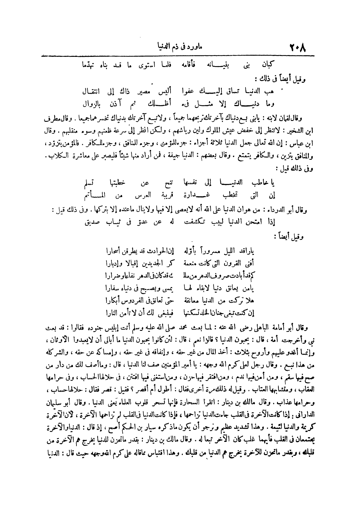 وقال أبو أمامة الباهلي رضي الله عنه لما بعث محمد صلى الله عليه وسلم أتت إبليس جنوده فقالوا قد بعث نبي وأخرجت أمة قال يحبون الدنيا قالوا نعم قال لئن كانوا يحبون الدنيا ما أبالي أن لا يعبدوا الأوثان وإنما أغدو عليهم وأروح بثلاث أخذ المال من غير حقه وإنفاقه في غير حقه وإمساكه عن حقه والشر كان من هذا نبع وقال رجل لعلي كرم الله وجهه يا أمير المؤمنين صف لنا الدنيا قال وما أصف لك من دار صح فيها سقم ومن أمن فيها ندم ومن افتقر فيها حزن ومن استغنى فيها افتتن في حلالها الحساب وفي حرامها العقاب ومتشابهها العتاب وقيل له ذلك مرة أخرى فقال أطول أم أقصر فقيل قصر فقال حلالها حساب وحرامها عذاب وقال مالك بن دينار اتقوا السحارة فإنها تسحر قلوب العلماء يعني الدنيا