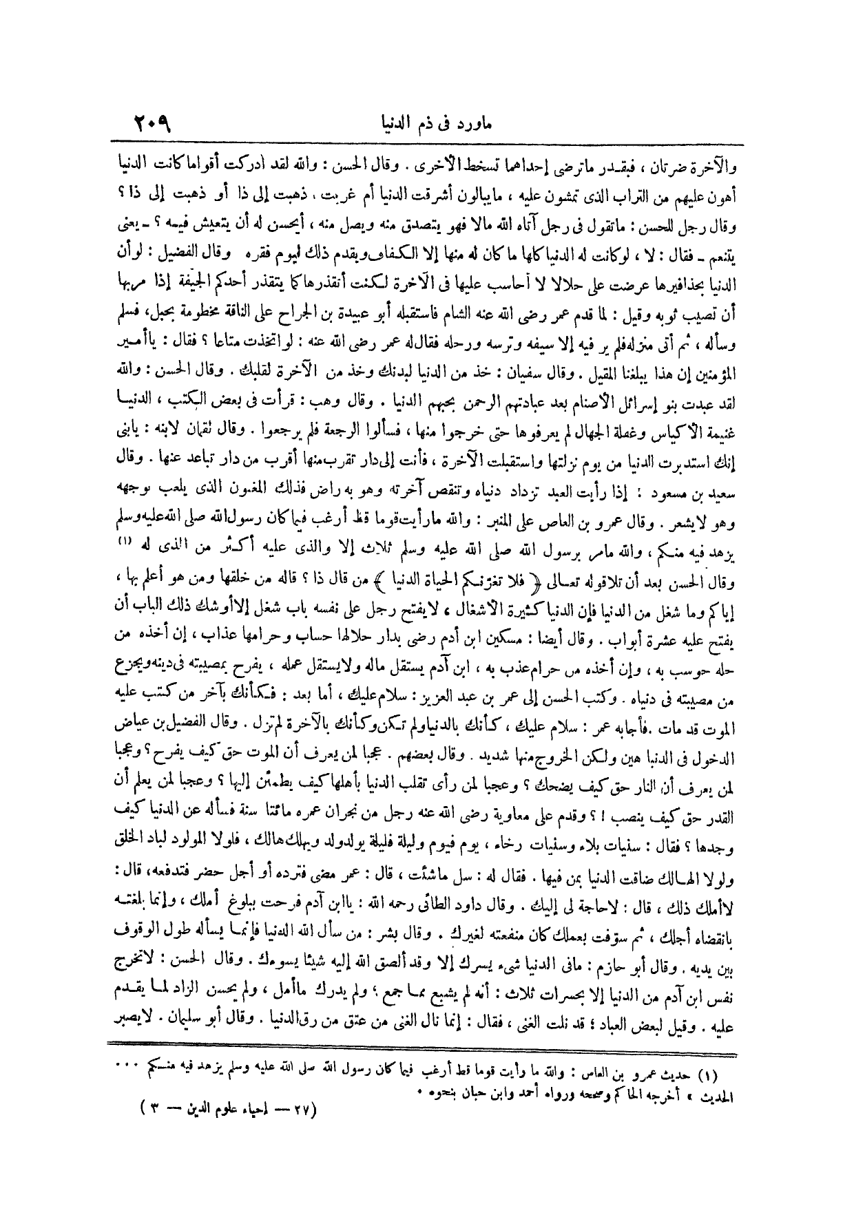 وقال الحسن بعد أن تلا قوله تعالى {فلا تغرنكم الحياة الدنيا} من قال ذا قاله من خلقها ومن هو أعلم بها إياكم وما شغل من الدنيا فإن الدنيا كثيرة الأشغال لا يفتح رجل على نفسه باب شغل إلا أوشك ذلك الباب أن يفتح عليه عشرة أبواب وقال أيضاً مسكين ابن أدم رضي بدار حلالها حساب وحرامها عذاب إن أخذه من حله حوسب به وإن أخذه من حرام عذب به ابن آدم يستقل ماله ولا يستقل عمله يفرح بمصيبته في دينه ويجزع من مصيبته في دنياه وكتب الحسن إلى عمر بن عبد العزيز سلام عليك أما بعد فكأنك بآخر من كتب عليه الموت قد مات فأجابه عمر سلام عليك كأنك بالدنيا ولم تكن وكأنك بالآخرة لم تزل وقال الفضيل بن عياض الدخول في الدنيا هين ولكن الخروج منها شديد وقال بعضهم عجباً لمن يعرف أن الموت حق كيف يفرح وعجباً لمن يعرف أن النار حق كيف يضحك وعجبا لمن رأى تقلب الدنيا بأهلها كيف يطمئن إليها وعجباً لمن يعلم أن القدر حق كيف ينصب وقدم على معاوية رضي الله عنه رجل من نجران عمره مائتا سنة فسأله عن الدنيا كيف وجدها فقال سنيات بلاء وسنيات رخاء يوم فيوم وليلة فليلة يولد ولد ويهلك هالك فلولا المولود لباد الخلق ولولا الهالك ضاقت الدنيا بمن فيها فقال له سل ما شئت قال عمر مضى فترده أو أجل حضر فتدفعه قال لا أملك ذلك قال لا حاجة لي إليك وقال داود الطائي رحمه الله يا ابن آدم فرحت ببلوغ أملك وإنما بلغته بانقضاه أجلك ثم سوفت بعملك كان منفعته لغيرك وقال بشر من سأل الله الدنيا فإنما يسأله طول الوقوف بين يديه وقال أبو حازم ما في الدنيا شيء يسرك إلا وقد ألصق الله إليه شيئاً يسوءك وقال الحسن لا تخرج نفس ابن آدم من الدنيا إلا بحسرات ثلاث أنه لم يشبع مما جمع ولم يدرك ما أمل ولم يحسن الزاد لما يقدم عليه وقيل لبعض العباد قد نلت الغنى فقال إنما نال الغنى من عتق من رق الدنيا وقال أبو سليمان لا يصبر