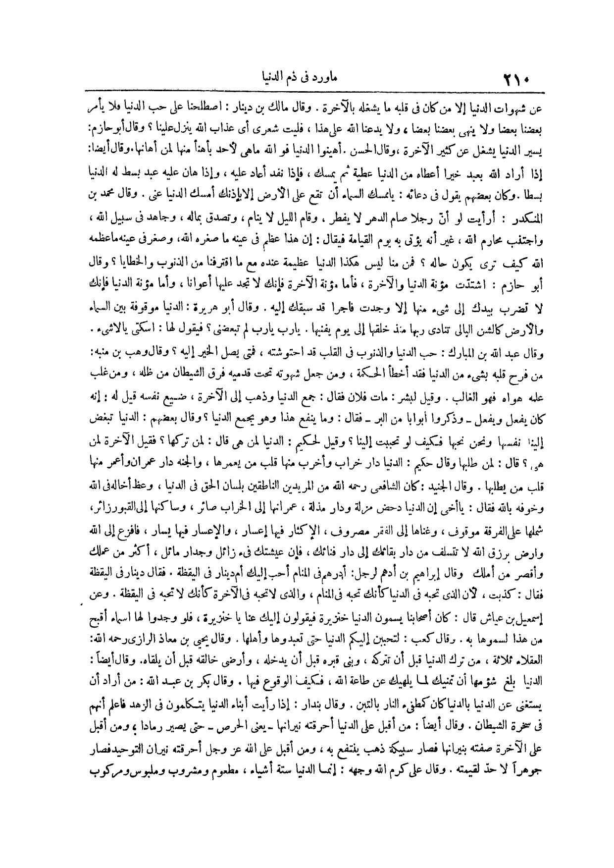 وقال أيضاً إذا أراد الله بعبد خيراً أعطاه من الدنيا عطية ثم يمسك فإذا نفذ أعاد عليه وإذا هان عليه عبد بسط له الدنيا بسطاً وكان بعضهم يقول في دعائه يا ممسك السماء أن تقع على الأرض إلا بإذنك أمسك الدنيا عني وقال محمد بن المنكدر أرأيت لو أن رجلاً صام الدهر لا يفطر وقام الليل لا ينام وتصدق بماله وجاهد في سبيل الله واجتنب محارم الله غير أنه يؤتى به يوم القيامة فيقال إن هذا عظم في عينه ما صغره الله وصغر في عينه ما عظمه الله كيف ترى يكون حاله فمن منا ليس هكذا الدنيا عظيمة عنده مع ما اقترفنا من الذنوب والخطايا وقال أبو حازم اشتدت مؤنة الدنيا والآخرة فأما مؤنة الآخرة فإنك لا تجد عليها أعواناً وأما مؤنة الدنيا فإنك لا تضرب بيدك إلى شيء منها إلا وجدت فاجراً قد سبقك إليه وقال أبو هريرة الدنيا موقوفة بين السماء والأرض كالشن البالي تنادي ربها منذ خلقها إلى يوم يفنيها يا رب يا رب لم تبغضني فيقول لها اسكتي يا لا شيء وقال عبد الله بن المبارك حب الدنيا والذنوب في القلب قد احتوشته فمتى يصل الخير إليه وقال وهب بن منبه من فرح قلبه بشيء من الدنيا فقد أخطأ الحكمة ومن جعل شهوته تحت قدميه فرق الشيطان من ظله ومن غلب علمه هواه فهو الغالب وقيل لبشر مات فلان فقال جمع الدنيا وذهب إلى الآخرة ضيع نفسه قيل له إنه كان يفعل ويفعل وذكروا أبواباً من البر فقال وما ينفع هذا وهو يجمع الدنيا وقال بعضهم الدنيا تبغض إلينا نفسها ونحن نحبها فكيف لو تحببت إلينا وقيل لحكيم الدنيا لمن هي قال لمن تركها فقيل الآخرة لمن هي قال لمن طلبها وقال حكيم الدنيا دار خراب وأخرب منها قلب من يعمرها والجنة دار عمران وأعمر منها قلب من يطلبها وقال الجنيد كان الشافعي رحمه الله من المريدين الناطقين بلسان الحق في الدنيا وعظ أخاً له في الله وخوفه بالله فقال يا أخي إن الدنيا دحض مزلة ودار مذلة عمرانها إلى الخراب صائر وساكنها إلى القبور زائر شملها على الفرقة موقوف وغناها إلى الفقر مصروف الإكثار فيها إعسار والإعسار فيها يسار فافزع إلى الله وارض برزق الله لا تتسلف من دار بقائك إلى دار فنائك فإن عيشتك فيء زائل وجدار مائل أكثر من عملك وأقصر من أملك وقال إبراهيم بن أدهم لرجل أدرهم في المنام أحب إليك أم دينار في اليقظة فقال دينار في اليقظة فقال كذبت لأن الذي تحبه في الدنيا كأنك تحبه في المنام والذي لا تحبه في الآخرة كأنك لا تحبه في اليقظة وعن إسماعيل بن عياش قال كان أصحابنا يسمون الدنيا خنزيرة فيقولون إليك عنا يا خنزيرة فلو وجدوا لها أسماء أقبح من هذا لسموها به وقال كعب لتحببن إليكم الدنيا حتى تعبدوها وأهلها وقال يحيى بن معاذ الرازي رحمه الله العقلاء ثلاثة من ترك الدنيا قبل أن تتركه وبنى قبره قبل أن يدخله وأرضى خالقه قبل أن يلقاه وقال أيضاً الدنيا بلغ شؤمها أن تمنيك لما يلهيك عن طاعة الله فكيف الوقوع فيها وقال بكر بن عبد الله من أراد أن يستغني عن الدنيا بالدنيا كان كمطفيء النار بالتبن وقال بندار إذا رأيت أبناء الدنيا يتكلمون في الزهد فاعلم أنهم في سخرة الشيطان وقال أيضاً من أقبل على الدنيا أحرقته نيرانها يعني الحرص حتى يصير رماداً ومن أقبل على الآخرة صفته بنيرانها فصار سبيكة ذهب ينتفع به ومن أقبل على الله عز وجل أحرقته نيران التوحيد فصار جوهراً لا حد لقيمته وقال علي كرم الله وجهه إنما الدنيا ستة أشياء مطعوم ومشروب وملبوس ومركوب