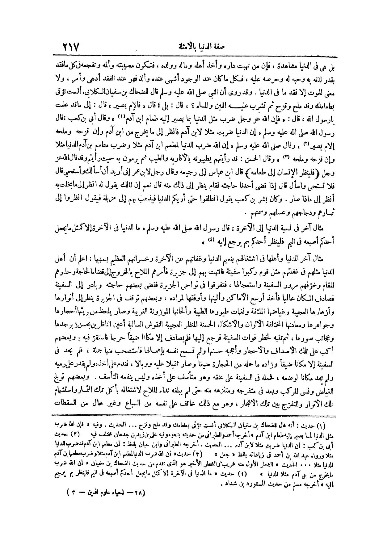 مثال آخر للدنيا وأهلها في اشتغالهم بنعيم الدنيا وغفلتهم عن الآخرة وخسرانهم العظيم بسببها اعلم أن أهل الدنيا مثلهم في غفلتهم مثل قوم ركبوا سفينة فانتهت بهم إلى جزيرة فأمرهم الملاح بالخروج إلى قضاء الحاجة وحذرهم المقام وخوفهم مرور السفينة واستعجالها فتفرقوا في نواحي الجزيرة فقضى بعضهم حاجته وبادر إلى السفينة فصادف المكان خالياً فأخذ أوسع الأماكن وألينها وأوفقها لمراده وبعضهم توقف في الجزيرة ينظر إلى أنوارها وأزهارها العجيبة وغياضها الملتفة ونغمات طيورها الطيبة وألحانها الموزونة الغريبة وصار يلحظ من بريتها أحجارها وجواهرها ومعادنها المختلفة الألوان والأشكال الحسنة المنظر العجيبة النقوش السالبة أعين الناظرين بحسن زبرجدها وعجائب صورها ثم تنبه لخطر فوات السفينة فرجع إليها فلم يصادف إلا مكاناً ضيقاً حرجاً فاستقر فيه وبعضهم أكب على تلك الأصداف والأحجار وأعجبه حسنها ولم تسمح نفسه بإهمالها فاستصحب منها جملة فلم يجد في السفينة إلا مكاناً ضيقاً وزاده ما حمله من الحجارة ضيقاً وصار ثقيلاً عليه ووبالاً فندم على أخذه ولم يقدر على رميه ولم يجد مكاناً لوضعه فحمله في السفينة على عنقه وهو متأسف على أخذه وليس ينفعه التأسف