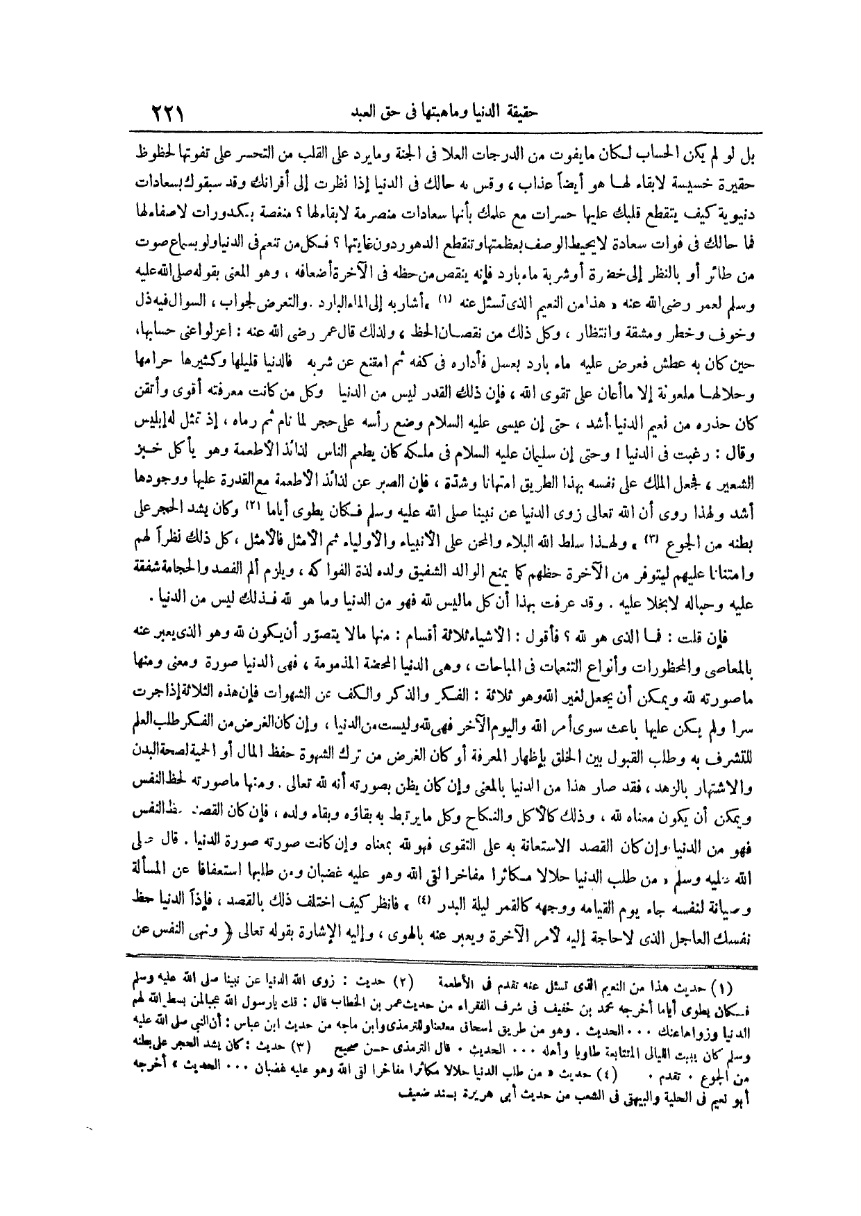 فإن قلت فما الذي هو لله فأقول الأشياء ثلاثة أقسام منها مالا يتصور أن يكون لله وهو الذي يعبر عنه بالمعاصي والمحظورات وأنواع التنعمات في المباحات وهي الدنيا المحضة المذمومة فهي الدنيا صورة ومعنى ومنها ما صورته لله ويمكن أن يجعل لغير الله وهو ثلاثة الفكر والذكر والكف عن الشهوات فإن هذه الثلاثة إذا جرت سراً ولم يكن عليها باعث سوى أمر الله واليوم الآخر فهي لله وليست من الدنيا وإن كان الغرض من الفكر طلب العلم للتشرف به وطلب القبول بين الخلق بإظهار المعرفة أو كان الغرض من ترك الشهوة حفظ المال أو الحمية لصحة البدن والاشتهار بالزهد فقد صار هذا من الدنيا بالمعنى وإن كان يظن بصورته أنه لله تعالى ومنها ما صورته لحظ النفس ويمكن أن يكون معناه لله وذلك كالأكل والنكاح وكل ما يرتبط به بقاؤه وبقاء ولده فإن كان القصد حظ النفس فهو من الدنيا وإن كان القصد الاستعانة به على التقوى فهو لله بمعناه وإن كانت صورته صورة الدنيا قال صلى الله عليه وسلم من طلب الدنيا حلالاً مكاثراً مفاخراً لقي الله وهو عليه غضبان ومن طلبها استعفافاً عن المسألة وصيانة لنفسه جاء يوم القيامة ووجهه كالقمر ليلة البدر (¬4)
