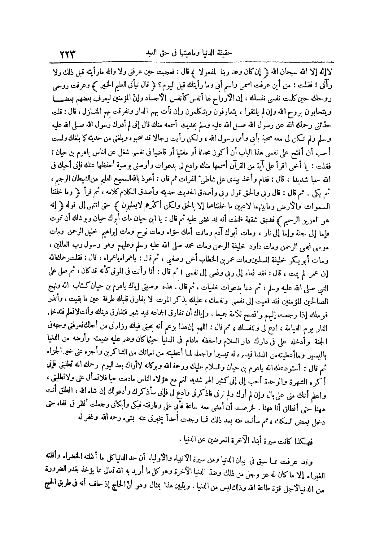 لا إله إلا الله سبحان الله إن كان وعد ربنا لمفعولا قال فعجبت حين عرفني ولا والله ما رأيته قبل ذلك ولا رآني فقلت من أين عرفت اسمي واسم أبي وما رأيتك قبل اليوم قال نبأني العليم الخبير وعرفت روحي روحك حين كلمت نفسي نفسك إن الأرواح لها أنفس كأنفس الأجساد وإن المؤمنين ليعرف بعضهم بعضاً ويتحابون بروح الله وإن لم يلتقوا يتعارفون ويتكلمون وإن نأت بهم الدار وتفرقت بهم المنازل قال قلت حدثني رحمك الله عَنْ رَسُولِ اللَّهِ صَلَّى اللَّهُ عَلَيْهِ وَسَلَّمَ بحديث أسمعه منك قال إني لم أدرك رسول الله صلى الله عليه وسلم ولم تكن لي معه صحبة بأبي وأمي رسول الله ولكن رأيت رجالاً قد صحبوه وبلغني من حديثه كما بلغك ولست أحب أن أفتح على نفسي هذا الباب أن أكون محدثاً أو مفتياً أو قاضياً في نفسي شغل عن الناس يا هرم بن حيان فقلت يا أخي اقرأ علي آية من القرآن أسمعها منك وادع لي بدعوات وأوصني بوصية أحفظها عنك فإني أحبك في الله حباً شديداً قال فقام وأخذ بيدي على شاطيء الفرات ثم قال أَعُوذُ بِاللَّهِ السَّمِيعِ الْعَلِيمِ مِنَ الشَّيْطَانِ الرَّجِيمِ ثم بكى ثم قال قال ربي والحق قول ربي وأصدق الحديث حديثه وأصدق الكلام كلامه ثم قرأ وما خلقنا السموات والأرض وما بينهما لاعبين ما خلقناهما إلا بالحق ولكن أكثرهم لا يعلمون حتى انتهى إلى قوله إنه هو العزيز الرحيم فشهق شهقة ظننت أنه قد غشي عليه ثم قال يا ابن حيان مات أبوك حيان وتوشك أن تموت فإما إلى جنة وإما إلى نار ومات أبوك آدم وماتت أمك حواء ومات نوح ومات إبراهيم خليل الرحمن ومات موسى نجى الرحمن ومات داود خليفة الرحمن ومات محمد صلى الله عليه وسلم وهو رسول رب العالمين ومات أبو بكر خليفة المسلمين ومات عمر بن الخطاب أخي وصفي ثم قال يا عمراه يا عمراه قال فقلت رحمك الله إن عمر لم يمت قال فقد نعاه إلي ربي ونعى إلى نفسي ثم قال أنا وأنت في الموت كأنه قد كان ثم صلى على النبي صلى الله عليه وسلم ثم دعا بدعوات خفيات ثم قال هذه وصيتي إياك يا هرم بن حيان كتاب الله ونهج الصالحين المؤمنين فقد نعيت إلى نفسي ونفسك عليك بذكر الموت لا يفارق قلبك طرفة عين ما بقيت وأنذر قومك إذا رجعت إليهم وانصح للأمة جميعاً وإياك أن تفارق الجماعة قيد شبر فتفارق دينك وأنت لا تعلم فتدخل النار يوم القيامة ادع لي ولنفسك ثم قال اللهم إن هذا يزعم أنه يحبني فيك وزارني من أجلك فعرفني وجهه في الجنة وأدخله علي في دارك دار السلام واحفظه ما دام في الدنيا حيثما كان وضم عليه ضيعته وأرضه من الدنيا باليسير وما أعطيته من الدنيا فيسره له تيسيراً واجعله لما أعطيته من نعمائك من الشاكرين وأجزه عني خير الجزاء ثم قال أستودعك الله يا هرم بن حيان والسلام عليك ورحمة الله وبركاته لا أراك بعد اليوم رحمك الله تطلبني فإني أكره الشهرة والوحدة أحب إلي أن كثير الهم شديد الغم مع هؤلاء الناس ما دمت حياً فلا تسأل عني ولا تطلبني واعلم أنك مني على بال وإن لم أرك ولم ترني فاذكرني وادع لي فإني سأذكرك وأدعو لك إن شاء الله انطلق أنت ههنا حتى أنطلق أنا ههنا