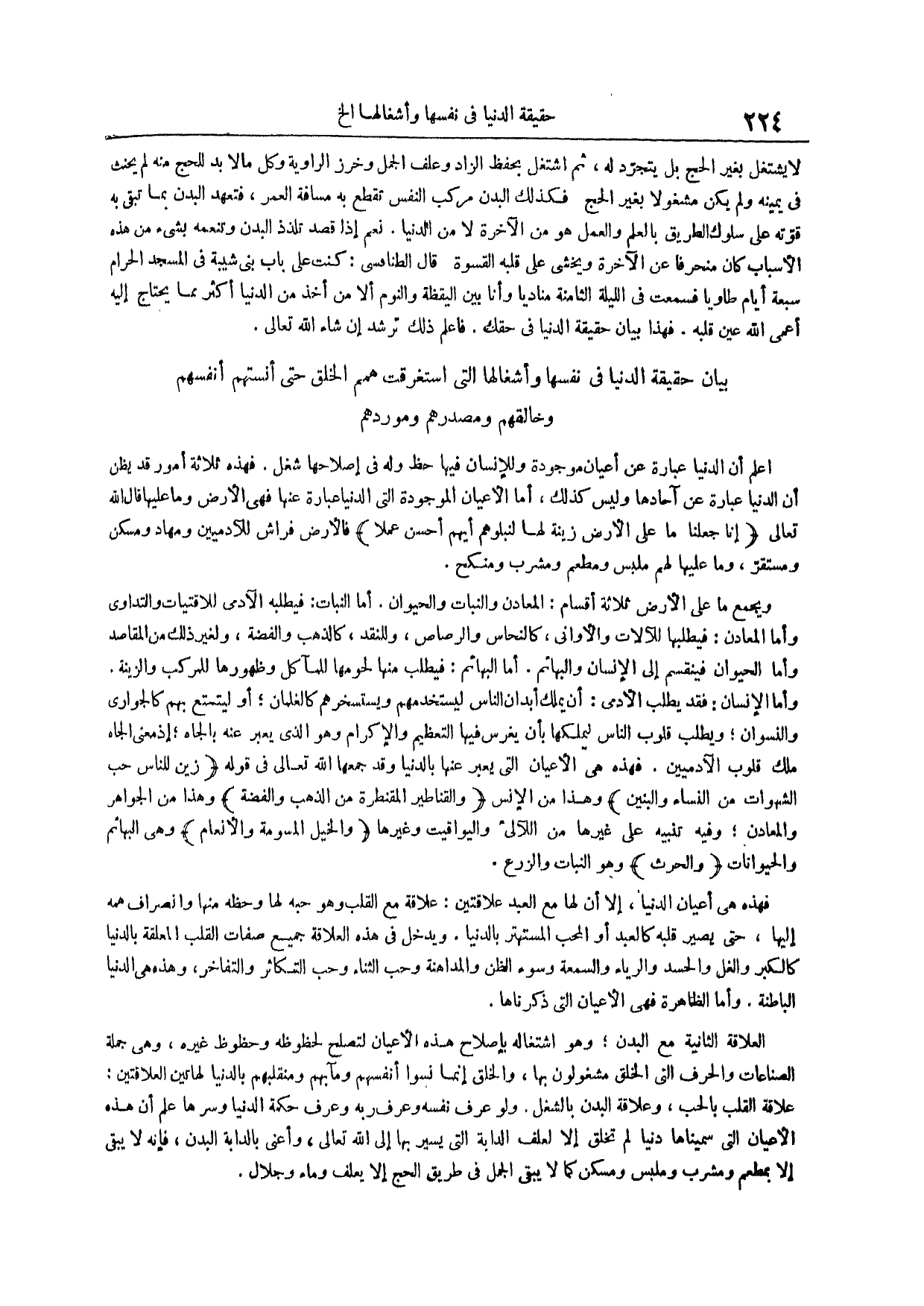 اعْلَمْ أَنَّ الدُّنْيَا عِبَارَةٌ عَنْ أَعْيَانٍ مَوْجُودَةٍ وللإنسان فيها حظ وله في إصلاحها شغل فهذه ثلاثة أمور قد يظن أن الدنيا عبارة عن آحادها وليس كذلك أما الأعيان الموجودة التي الدنيا عِبَارَةٌ عَنْهَا فَهِيَ الْأَرْضُ وَمَا عَلَيْهَا قَالَ اللَّهُ تَعَالَى إِنَّا جَعَلْنَا مَا عَلَى الْأَرْضِ زينة لها لنبلوهم أيهم أحسن عملاً فَالْأَرْضُ فِرَاشٌ لِلْآدَمِيِّينَ وَمِهَادٌ وَمَسْكَنٌ وَمُسْتَقَرٌّ وَمَا عَلَيْهَا لَهُمْ مَلْبَسٌ وَمَطْعَمٌ وَمَشْرَبٌ وَمَنْكَحٌ